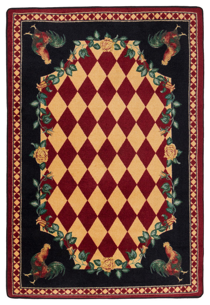 Add a touch of country charm with this timeless design. Regal Roosters frame harliquin diamonds. Traced in pretty roses this rug will interject some color into your space. Made from premium EnduraStran nylon this rug is easy to clean and made in AMERICA. Available in 6 sizes.