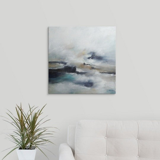 Gallery-wrapped canvas entitled, "High Tide Wave II".Abstract painting of waves crashing into a rocky shoreline at high tide, beneath a light cloudy sky.Our wrapped canvases feature a proprietary design that prevents warping or sagging over time. By using archival inks and artist-grade canvas, our premium canvases are sure to add that extra touch to any space. Lastly, our canvases are finished with a closed back that incorporates pre-installed hanging hardware for easy installation.