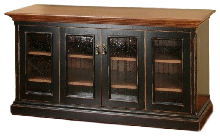 Finished in distressed black with a plain wood top, the Hillsboro Media Console has an elegant, antique feel. Pair it with traditional decor for a cohesive feel. Made in USA.