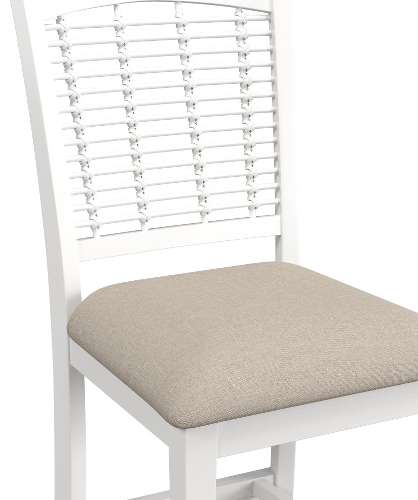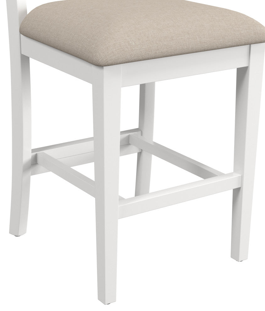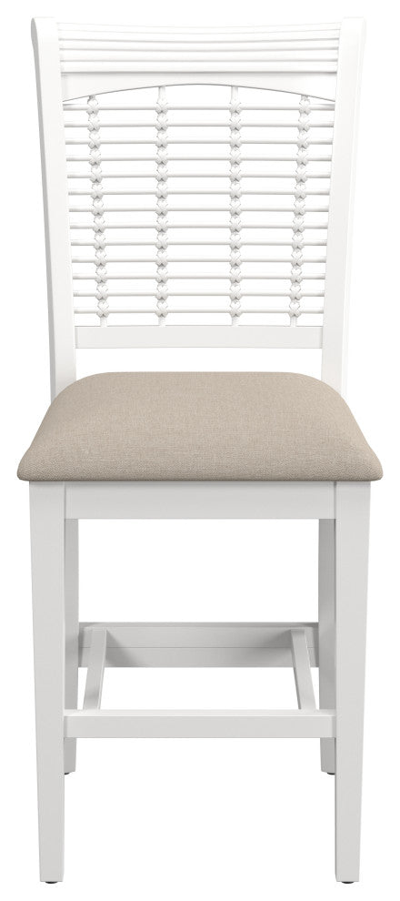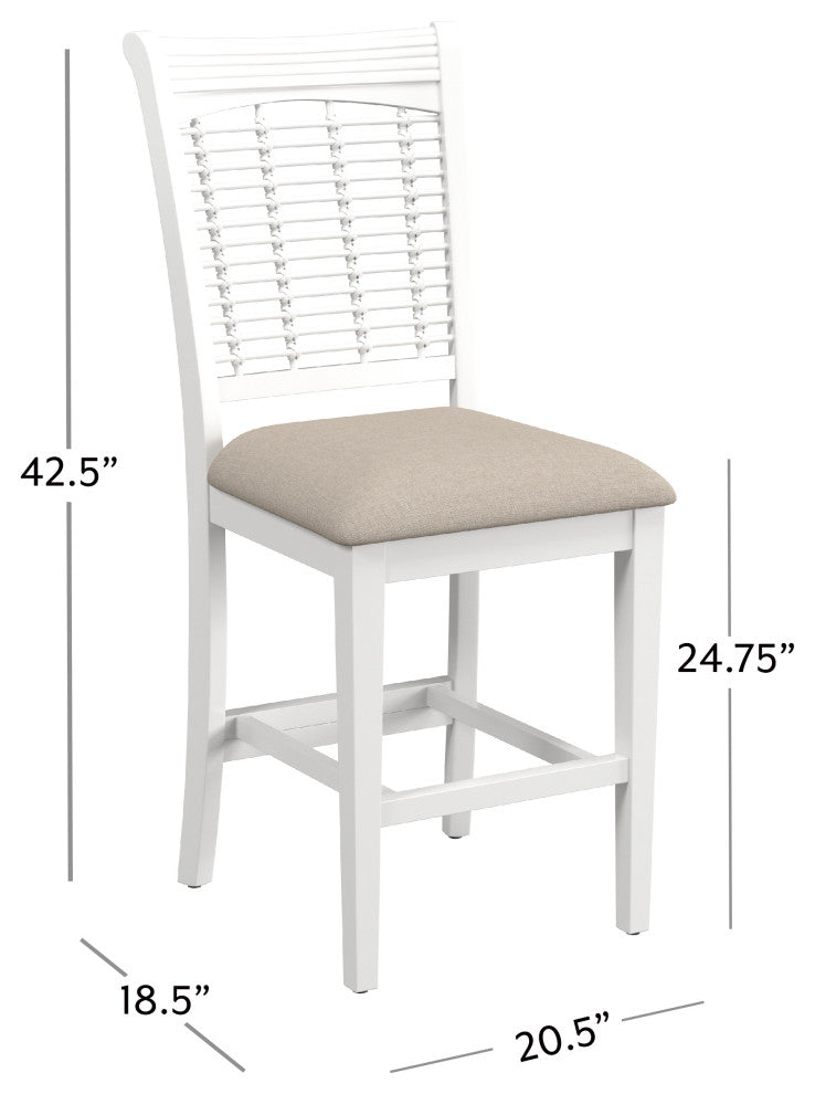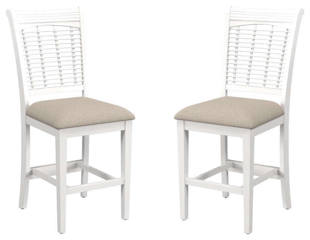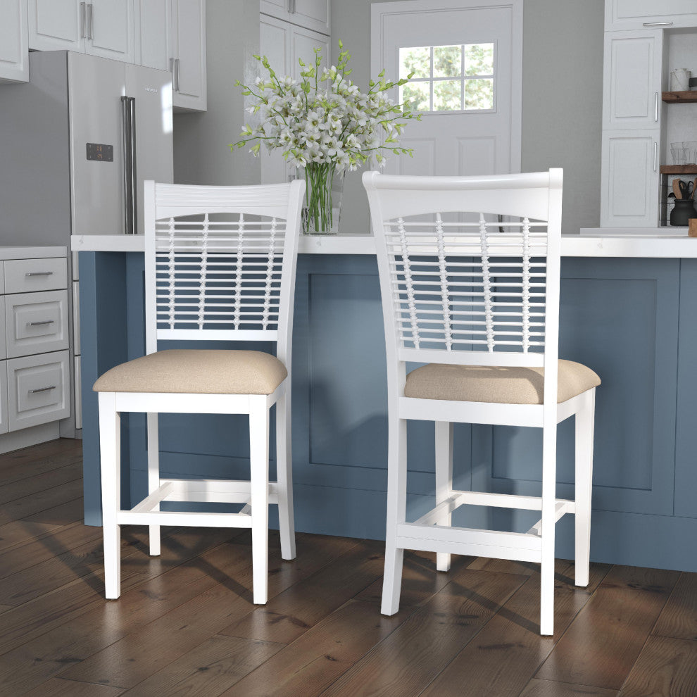 Bring a sense of farmhouse energy into your dining and entertaining spaces to make you and your guests feel easy and breezy with these Counter Stools. This set of two stationary counter stools are each crafted from durable wood in an airy, white wood finish, with cozy seats upholstered in light beige fabric that''s easy to maintain. Plus, the high, wicker-style backs of these stools offer the perfect support to lean back and relax, pleasing both your sense of comfort and aesthetics. Assembly required.