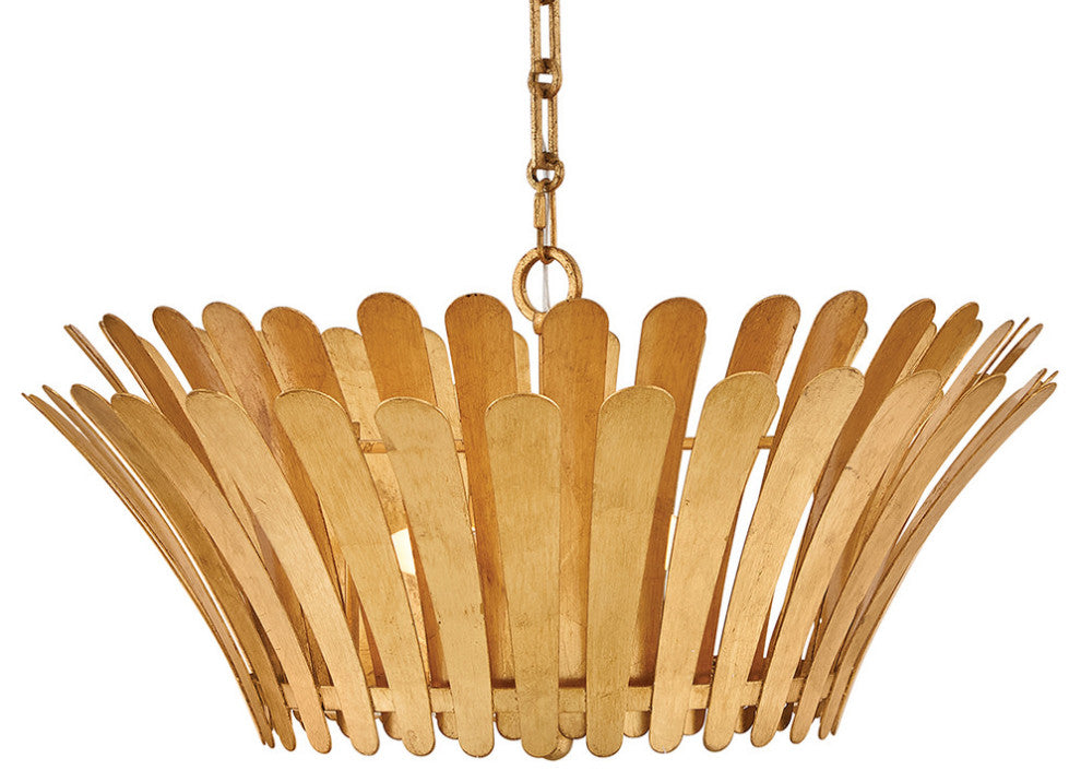 Remarkably dramatic, Reina''s repeating flared fronds surround its central drum and etched white glass diffuser, making a refined yet striking statement within any space. A Distressed Brass finish creates a classic look while the white Textured Plaster finish provides a more modern feel.