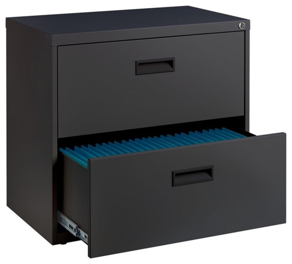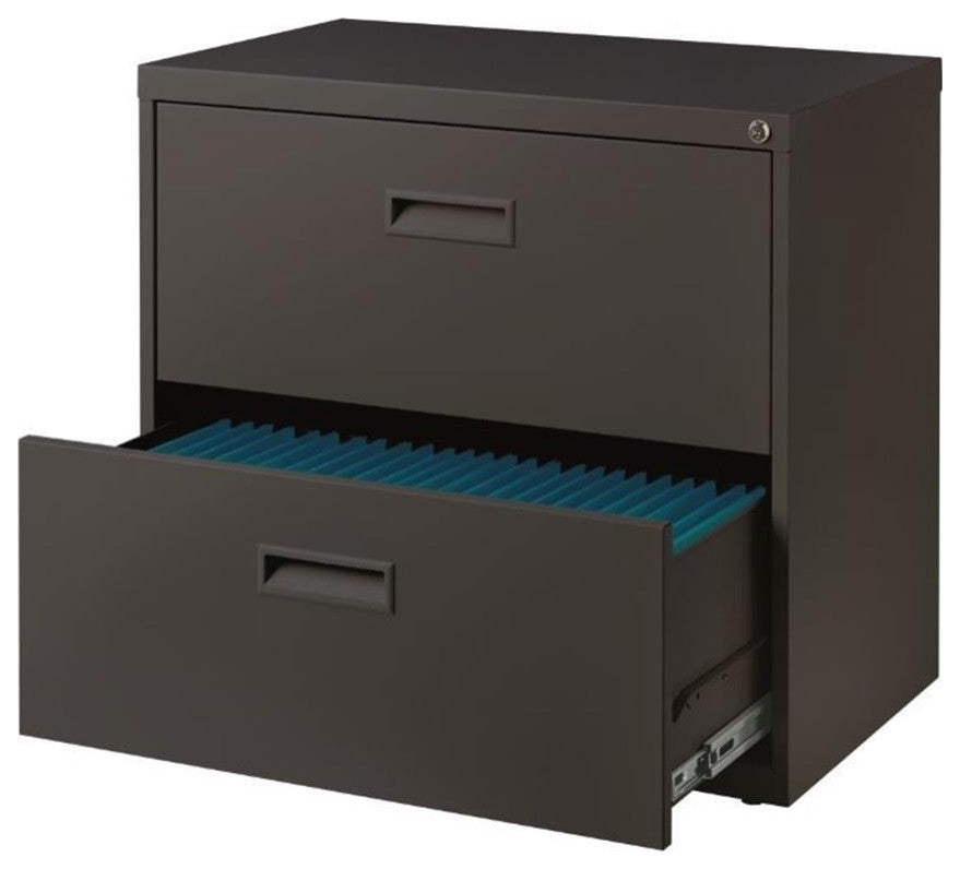 This charcoal metal lateral is a durable, economical storage solution and is great for small spaces. The fully assembled steel construction with non-porous surface is easy to clean and sanitize.Features: • Lock secures both drawers • Material: Steel • Drawers accommodate letter size hanging files • Interlock allows only one drawer to open at a time for safety • Contains up to 30% recycled material • GREENGUARD Gold certified • Greenguard Gold CertifiedSpecifications: • Product Dimensions: 27.75" H X 30.00" W X 17.63" D • Product Weight: 57.5 • Assembly Required: No • Assembly details: To ensure the key for this product does not get loose, slide the thumb latch on left side of handle to the right, at the same time, pull the drawer open. Keys are hanging inside the cabinet by the locking mechanism.