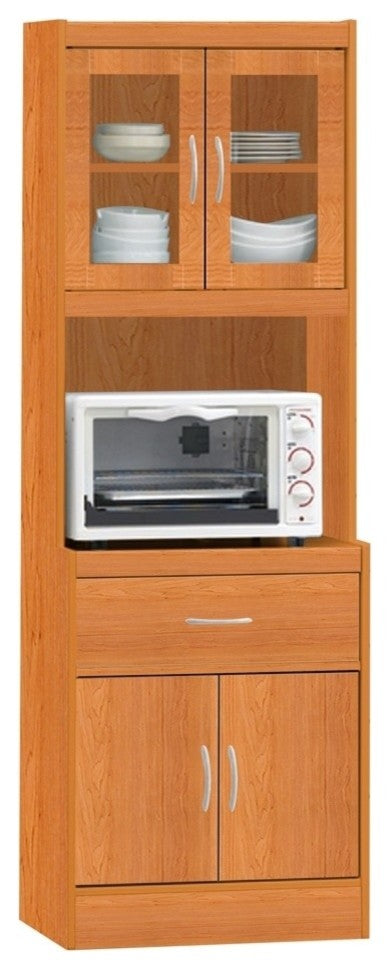 Running out of cabinet space in your home, The Hodedah China Cabinet is a simple yet versatile piece that is sure to add functionally to your kitchen. Standing tall this unit features a large open shelf space at the center to house your microwave or toaster oven. Transparent doors on the top opens to reveal two shelves, ideal for displaying fancy dinnerware. For extra storage there is another enclosed cabinet below to store small appliances, pots and pans. The single drawer located in the center of this unit provide ample room to store cutlery, kitchen towels and other small gadgets. So go ahead and bring this cottage inspired piece into your home, not only will it provide ample storage from top to bottom but it will serve up functionality and versatility.Features : • Convenient and accessible way to store your microwave, toaster and other small appliances • Transparent doors on the top displays your fancy dinnerware • Drawer to store kitchen utensils • Constructed of durable engineered wood that will sure to last many years to come • Enclosed cabinet on top and bottom of unit to house pots and pans • Functional and attractive with its sleek contemporary styling • Available in 6 color options: Beige, Black-Beige, Cherry, Chocolate-Grey, Grey-Oak and WhiteSpecifications : • Product Dimensions : 70.86 in. H x 23.85 in. W x 15.75 in. D • Assembly Required : Yes