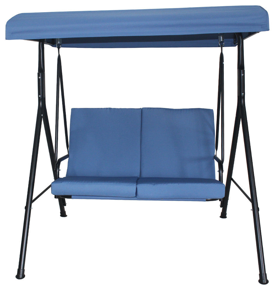 ITEM#: 33492374 Enjoy beautiful weather with your friends and family when you lounge on this HomeBeyond Two-person porch bench. The frame is made from durable powder-coated steel with a water-resistant polyester canopy for extra shade. The seats are curved for a comfortable seating angle complete with arm rests on each side. Sit back, grab your favorite drink, and let the summer breeze take you away in this relaxing HomeBeyond backyard swing chair. Features: - Perfect for a garden, park, patio, yard, backyard and other outdoor areas - Comfortably swings up to 2 people for the perfect outdoor lounging experience - Solid powder-coated steel frame supports up to 500 pounds of weight - Water-resistant, fabric canopy top offers UV protection and sun shade - Adjustable canopy top allows you to change its angle throughout the day - Cushion filled with thick cotton and covered with 160g water-resistant fabric Assembly required Specifications: - Color: Blue - Material: Steel Pipe, Polyester Cloth - Overall Dimensions: 52.16"L x 43.3"W x 62.2"H - Seat Dimensions: 39.4"L x 19"W - Seat To Floor Height: 121.65"H - Weight Capacity: 500 lbs Assembly Required Cover Back to Front Width: 42.5"