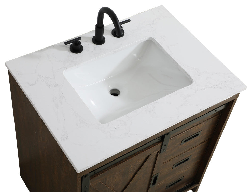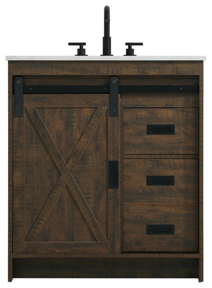 Transform your bathroom with this rustic barnyard-style vanity, designed to balance aesthetic appeal and functionality. Featuring a sliding barn door with black metal hardware and complementary handle pulls, this piece blends rugged charm with practical design. The engineered marble countertop displays unique marbling, while the porcelain undermount sink offers easy maintenance and durability. Available in Espresso, Natural Oak, and Rustic Grey finishes, this vanity suits a range of styles. It includes a deep storage drawer for larger items, a hidden shelf for towels or decor, and adjustable foot levelers for added stability on uneven floors. With pre-drilled faucet holes for easy setup, this vanity delivers style and substance to enhance your bathroom.