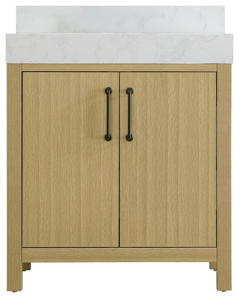 This bathroom vanity showcases a balanced blend of contemporary style and warm, natural-like elements, making it a versatile addition to various interior designs. The clean, straight edges and flat-panel doors lend a modern, streamlined look, while the soft, light wood finish highlights the faux grain pattern, adding warmth and a sense of organic texture to the piece. The vanity features a functional layout, with two cabinet doors, creating a balanced and organized look. Matte black hardware, including slim and cylindrical pulls, contrasts elegantly against the light wood, reinforcing its contemporary vibe while providing subtle visual interest. The thick engineered marble countertop in crisp white adds a sharp contrast to the light base, creating a visually dynamic combination that is both functional and stylish. This vanity is perfect for those seeking a design that combines modern simplicity with a touch of bold refinement. This vanity is delivered fully assembled and equipped with foot levelers for effortless installation and stability. Combining practicality and bold design, this vanity is UPC certified and ready to transform your bathroom space. The matching backsplash seamlessly integrates with the countertop, offering a cohesive design that protects walls from splashes while maintaining a unified look.