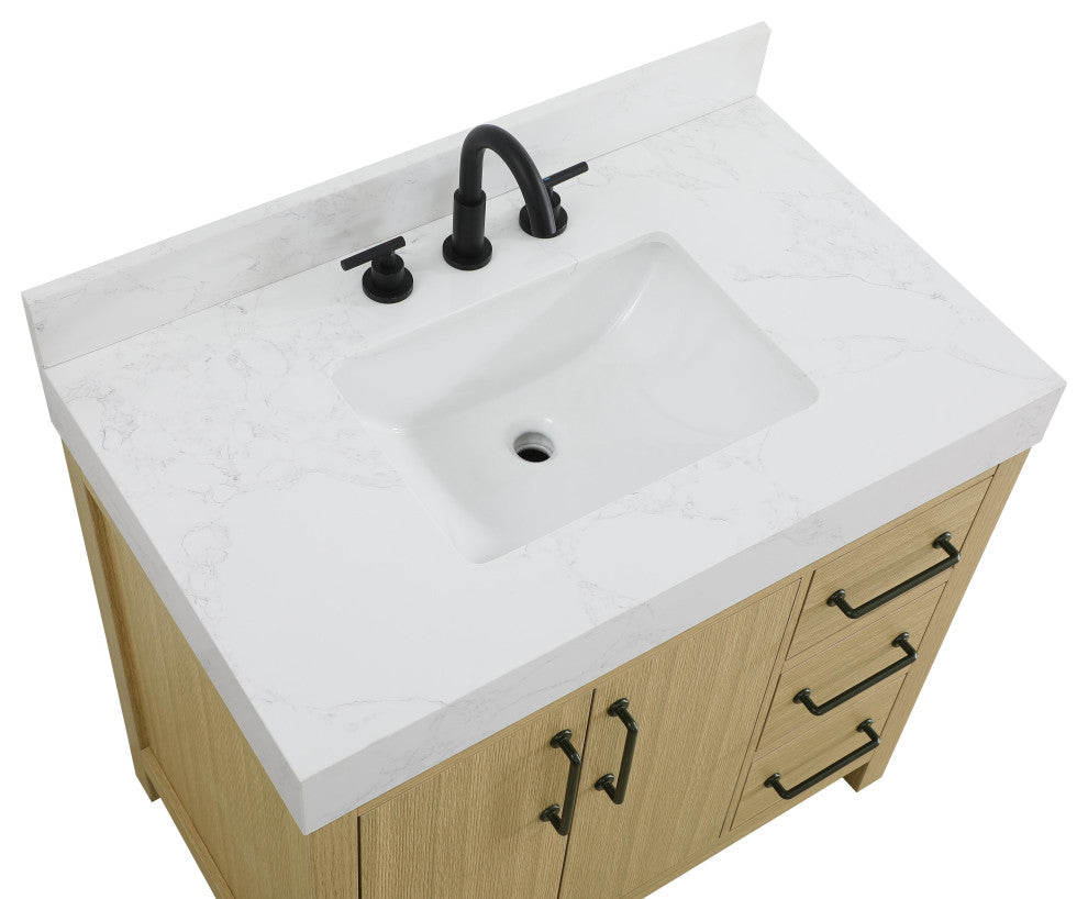 This bathroom vanity showcases a balanced blend of contemporary style and warm, natural-like elements, making it a versatile addition to various interior designs. The clean, straight edges and flat-panel doors lend a modern, streamlined look, while the soft, light wood finish highlights the faux grain pattern, adding warmth and a sense of organic texture to the piece. The vanity features a functional layout, with two cabinet doors on one side and three stacked drawers on the other, creating a balanced and organized look. Matte black hardware, including slim and cylindrical pulls, contrasts elegantly against the light wood, reinforcing its contemporary vibe while providing subtle visual interest. The thick engineered marble countertop in crisp white adds a sharp contrast to the light base, creating a visually dynamic combination that is both functional and stylish. This vanity is perfect for those seeking a design that combines modern simplicity with a touch of bold refinement. This vanity is delivered fully assembled and equipped with foot levelers for effortless installation and stability. Combining practicality and bold design, this vanity is UPC certified and ready to transform your bathroom space. The matching backsplash seamlessly integrates with the countertop, offering a cohesive design that protects walls from splashes while maintaining a unified look.