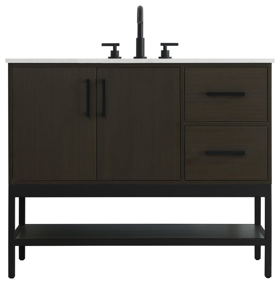 Upgrade your bathroom with this modern bathroom vanity that combines form and function effortlessly. Its sleek wood veneer cabinetry, paired with a bold black metal frame, brings a clean, contemporary vibe to any space. Designed with practicality in mind, this vanity offers soft-close drawers and cabinets to organize your essentials, as well as an open lower shelf for added storage or display. The durable white quartz countertop is built to withstand daily use, while the undermount ceramic sink ensures easy maintenance. Complete with matte black hardware and pre-drilled features for effortless installation, this vanity is the perfect centerpiece to refresh your bathroom with style and efficiency.