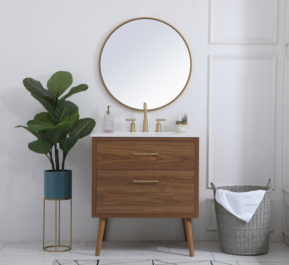 Delve into a world of minimalistic fashion and contemporary styling with this midcentury modern 30" vanity. The clean lines anchors the design, while the oblique tapered cylinder legs add subtle interest. However, the artful juxtaposition between the walnut brown and matte white creates a blend of bright modernity and classical traditions. A gold handle adorns the top fake drawer hiding the base of the integrated porcelain sink while another one allows you to pull the bottom drawer out, letting you store your bathroom necessities and toiletries. The compact size makes it the perfect vanity for any bathroom or powder room, regardless of size. (FAUCET NOT INCLUDED)Walnut Brown finishConstructed with MDF and solid woodMinimalistic gold bar pull handle designporcelain sink and engineered marble countertopone deep bottom drawer with one false top drawer three hole faucet hole design (faucet not included)Round slayed legs design, minor leg assembly neededOur faux wood finish is meticulously crafted to resemble the real thing, but with added durability and resistance to moisture. So, you can enjoy the look of wood without any of the upkeep! The vanity base is a smooth non-textured surface.