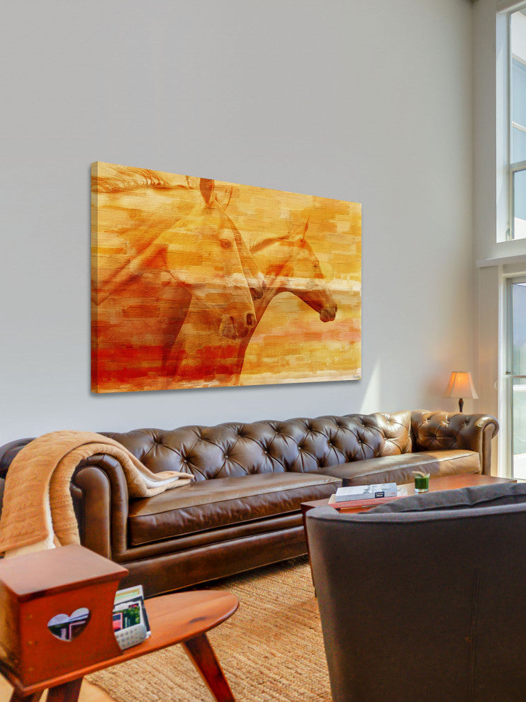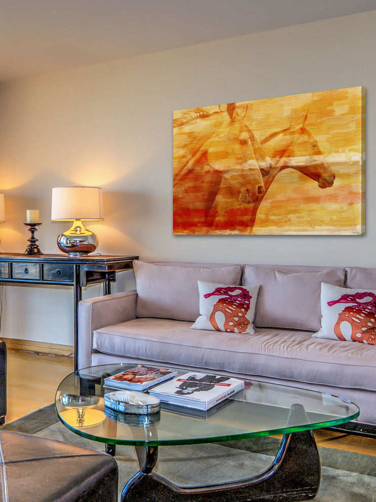 Striking and unique, the "Horsey" Print on Canvas by Parvez Taj will bring your walls to life. Printed on canvas, this 36 inch wide by 24 inch tall contemporary artwork will make a statement in any living room, dining room, or bedroom.- Fine art canvas print by Parvez Taj- Professionally hand stretched- Gallery wrapped in sustainable, non-warping wood- Arrives ready to hang- Made in the USA- Includes a certificate of authenticity- Artist signature on the front