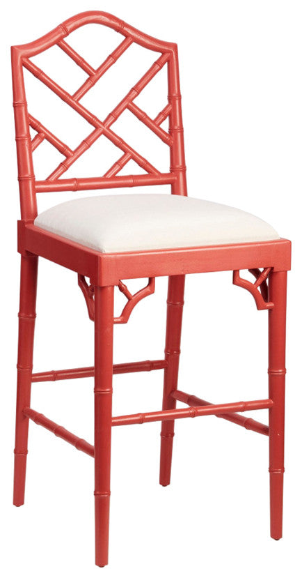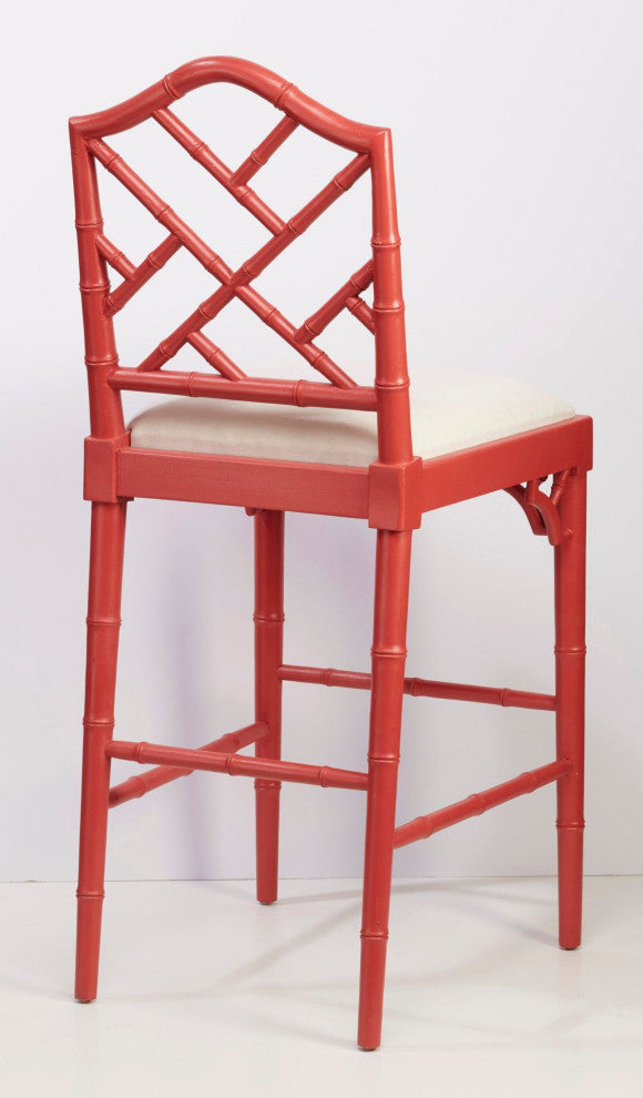 Boasting Chinese Chippendale aesthetics is the Hosteen Bar Stool. Constructed from solid mahogany. The wood frame is hand carved to give off a bamboo-like design. The seat cushion is wrapped in classic white linen fabric. This classic Chippendale piece is the perfect addition to your dining or living areas.Features:Overall product dimensions are 20" W x 22" D x 48" HConstructed from solid mahogany woodBrings the Chinese Chippendale design to contemporary settingsCushioned seat for comfort and easeAvailable in multiple color variationsDimensions:Bar StoolAssembled Product: 20 inches wide x 22 inches deep x 48 inches high.