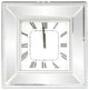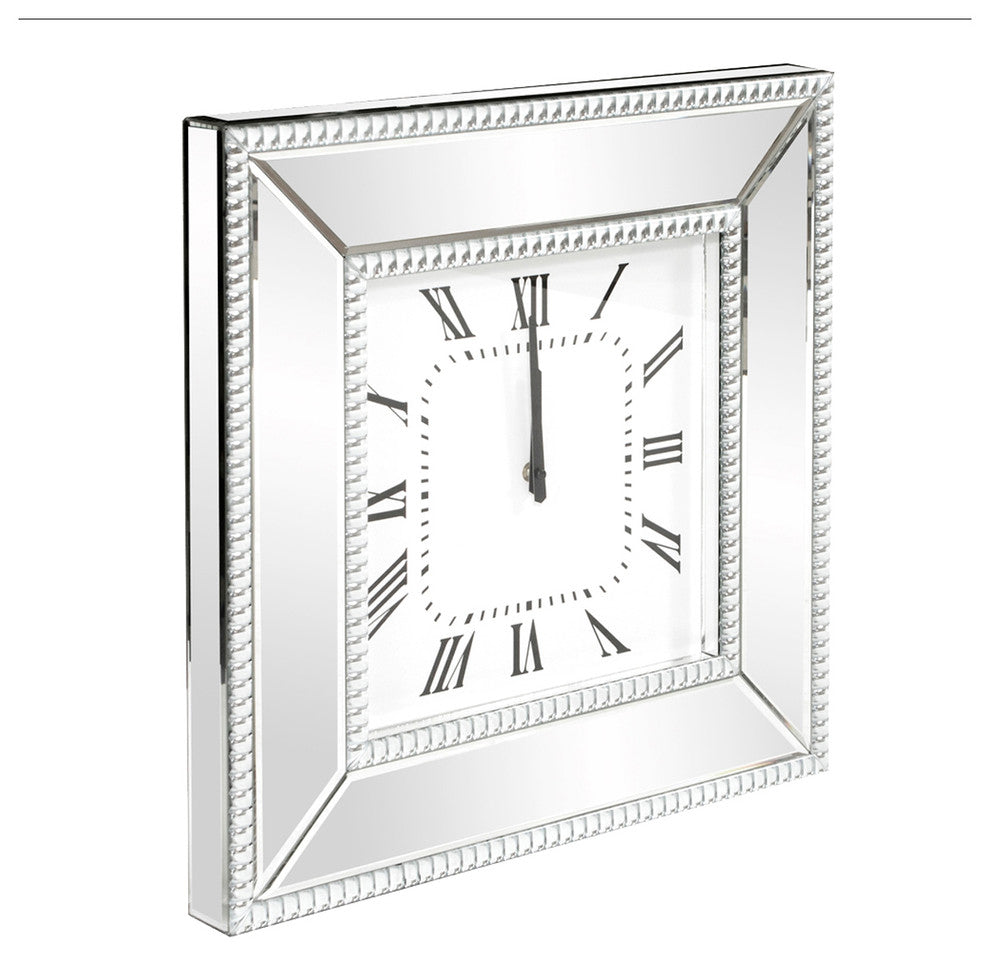 This wall clock features a square mirrored frame that offers the most amazing reflections of light and color. Each mirrored panel has a small bevel adding to its beauty and style. The piece is then trimmed in a beaded glass border. The clock face features Roman Numerals and slim black hands. The clock uses AA batteries that are not included. D-rings are affixed to the back of the mirror so it is ready to hang right out of the box!