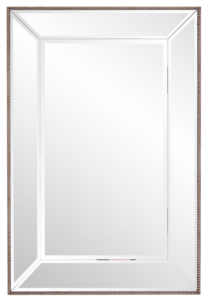 Our Roberto Mirror has stunning classic beauty and sophisticated style. It is rectangular in shape and features a mirrored frame that is outlined with a champagne antique silver beaded trim. It is a perfect focal point for an entryway, bathroom, bedroom or any room in your home. D-rings are affixed to the back of the mirror so it is ready to hang right out of the box in either a horizontal or vertical orientation! The glass is beveled adding to its style and beauty.Overall dimensions: 24" x 36" x 1.1/2"Overall frame size: 24" x 36"Mirror size: 16" x 28"