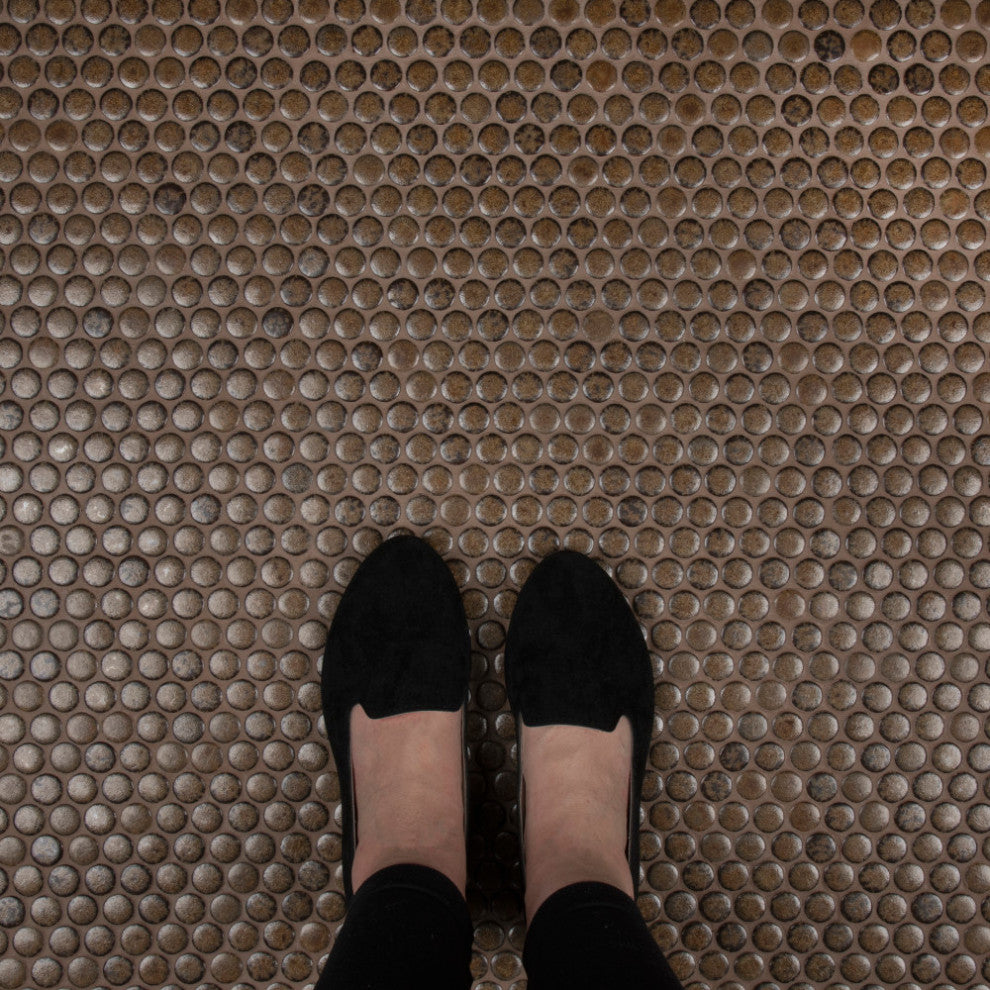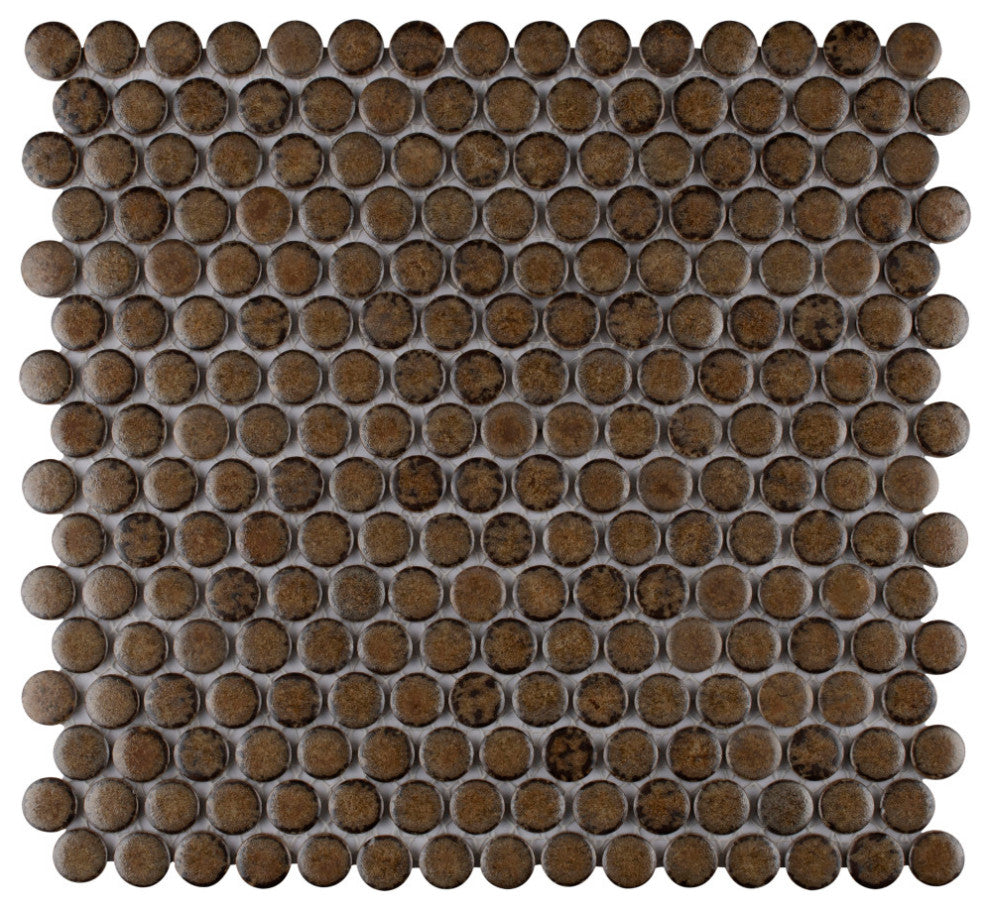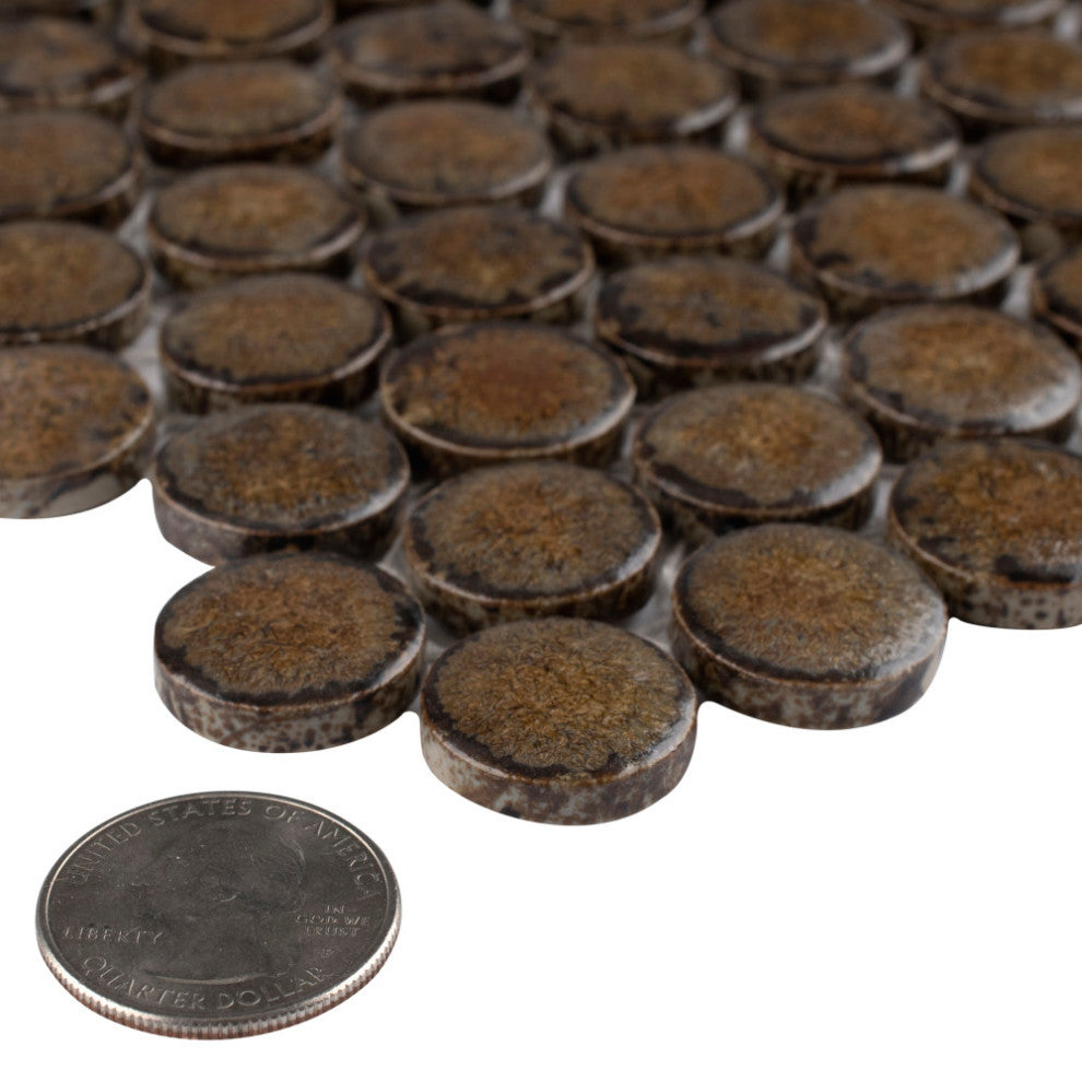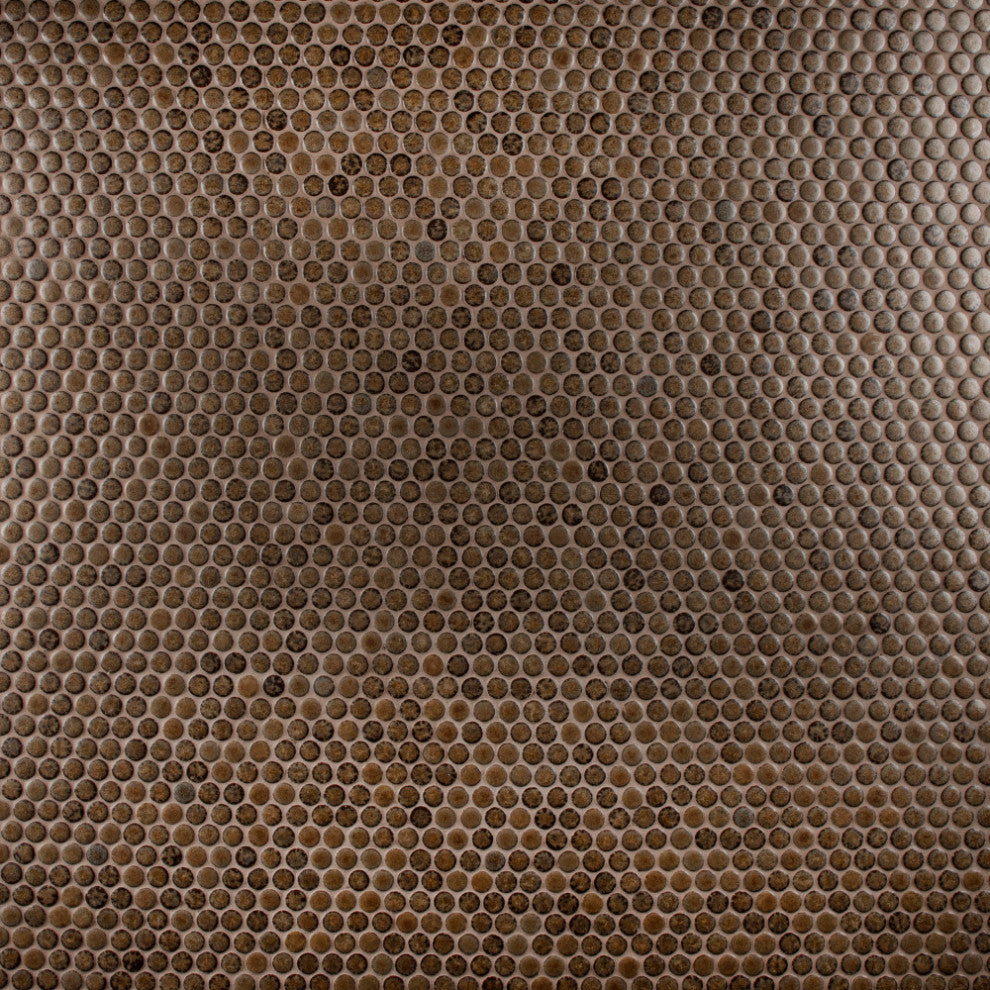 Our Hudson Penny Round Brownstone Porcelain Mosaic Tile is a beautifully tranquil update on the timeless penny round design. Featuring a reactive glaze with a soft crystallized effect, these tiles have hues of mossy brown that gradually blend to a dark brown around the edges. This mosaic creates a uniquely sporadic design through a pleasing mixture of earth-toned tints with additional dimension added by the smooth, high-gloss finish. Its impervious and frost-resistant features make this penny tile an ideal choice for indoor and outdoor floor and wall installations including, kitchen backsplashes, bathroom showers and accent walls. This penny round tile can be used as a whole sheet or cut into smaller strips as an accent piece. It is a perfect choice on its own or coordinated with other colors in our Hudson Penny Round series.