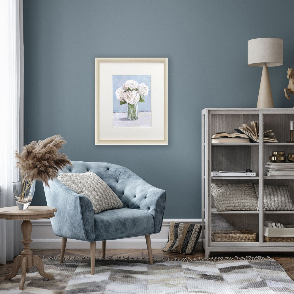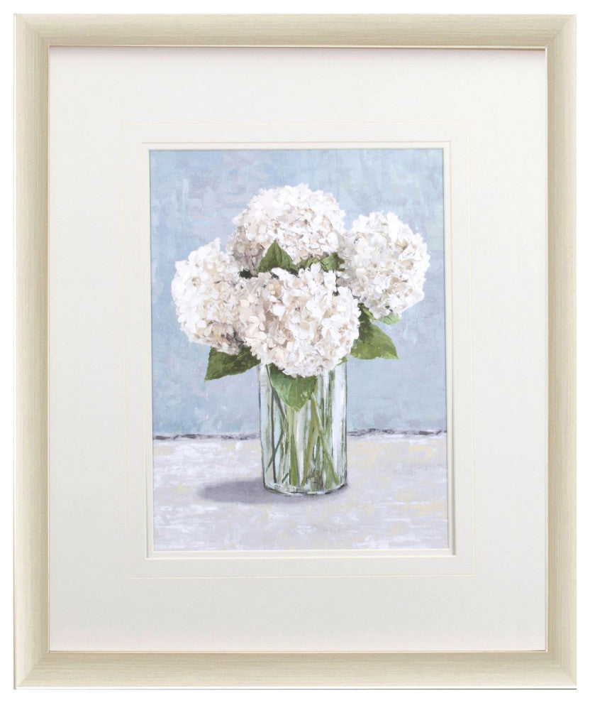 A hydrangea floral print double matted and accentuated with a v-groove. Also framed under glass and paired with a champagne frame.