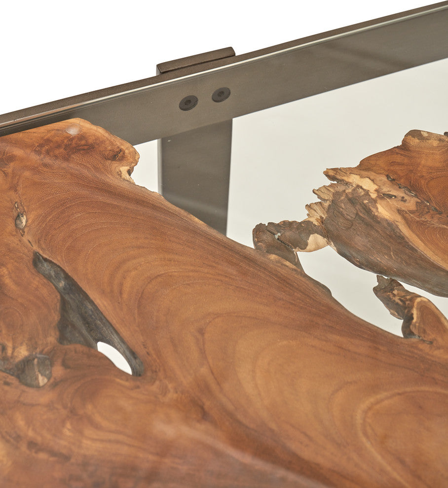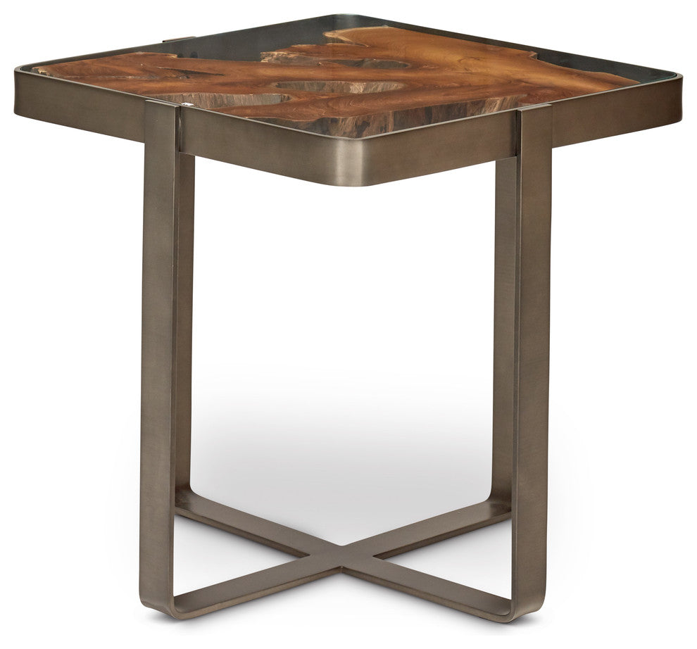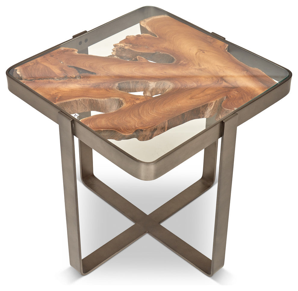 Mixing organic and industrial designs, the Kullen End Table features a solid teak slab laid in tempered glass. The square top is encased in galvanized gray stainless steel and sits a top steel legs, creating sleek lines. / Mixed media / Modern design / Solid teak wood / Color/Finish: Teak / Materials: Solid Teak Wood, Tempered Glass, Stainless Steel / Top Color/Finish: Teak / Top Material: Solid Teak Wood, Tempered Glass / Table Shape: Square / Table Top Thickness: N/A / Base/Leg Color/Finish: N/A / Base/Leg Material: N/A / Weight Capacity: 25 lbs