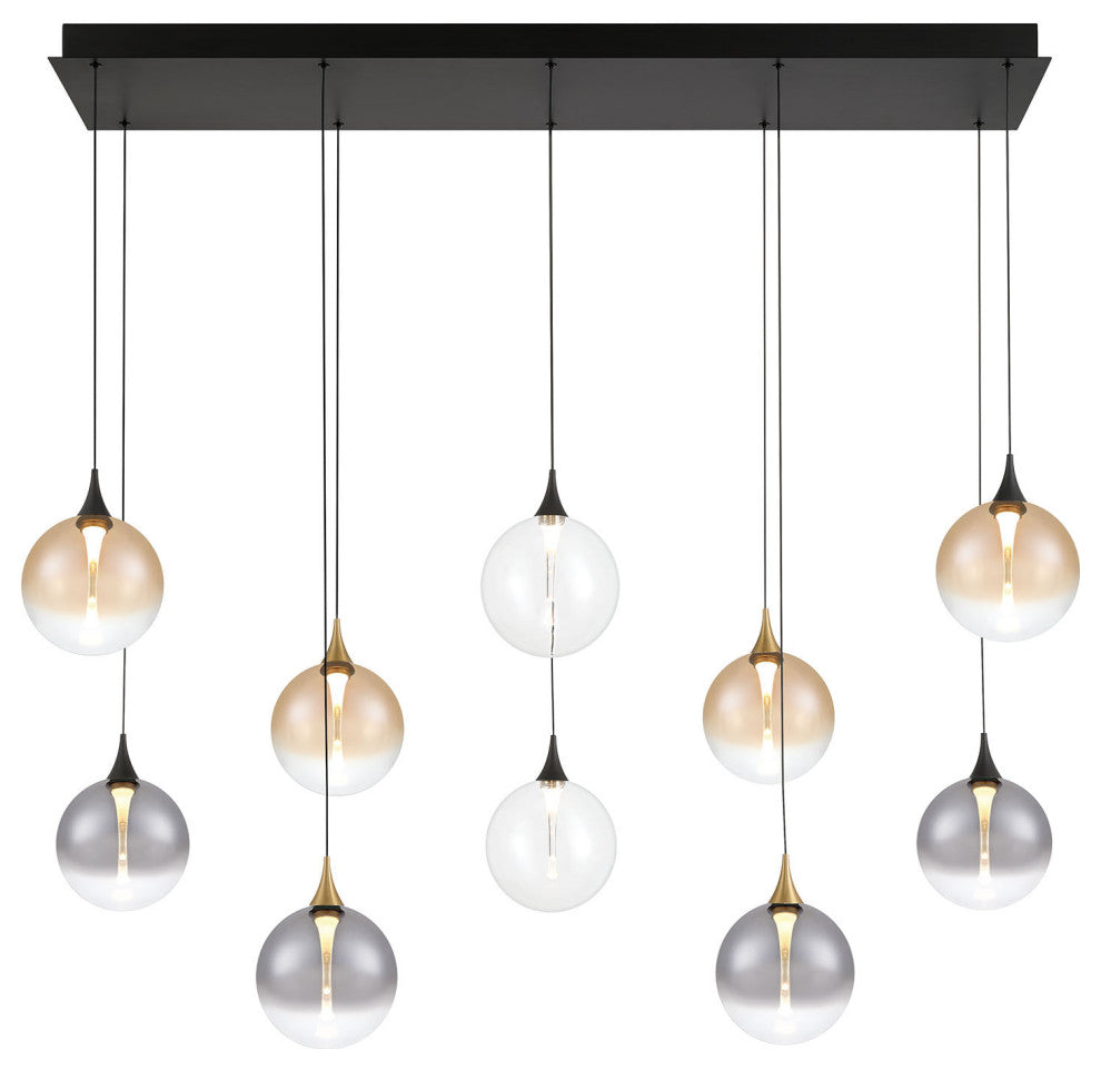 This elegant chandelier features a mix of gold and black finishes, along with globe-shaped mixed glass that adds a unique twist to its design. With 10 lights arranged in a cascading formation, this fixture is the perfect blend of chic and industrial style, making it a stunning focal point for any contemporary setting. This product is cETLus certified.•Number of Lights: 10•Bulb Type: LED integrated•Wattage: 4.5W•LED Color Temperature (K): 3000K•Dimmable: Yes•Bulb Included: Yes•Voltage: 120V•Hardwire or Plug-in: Hardwired