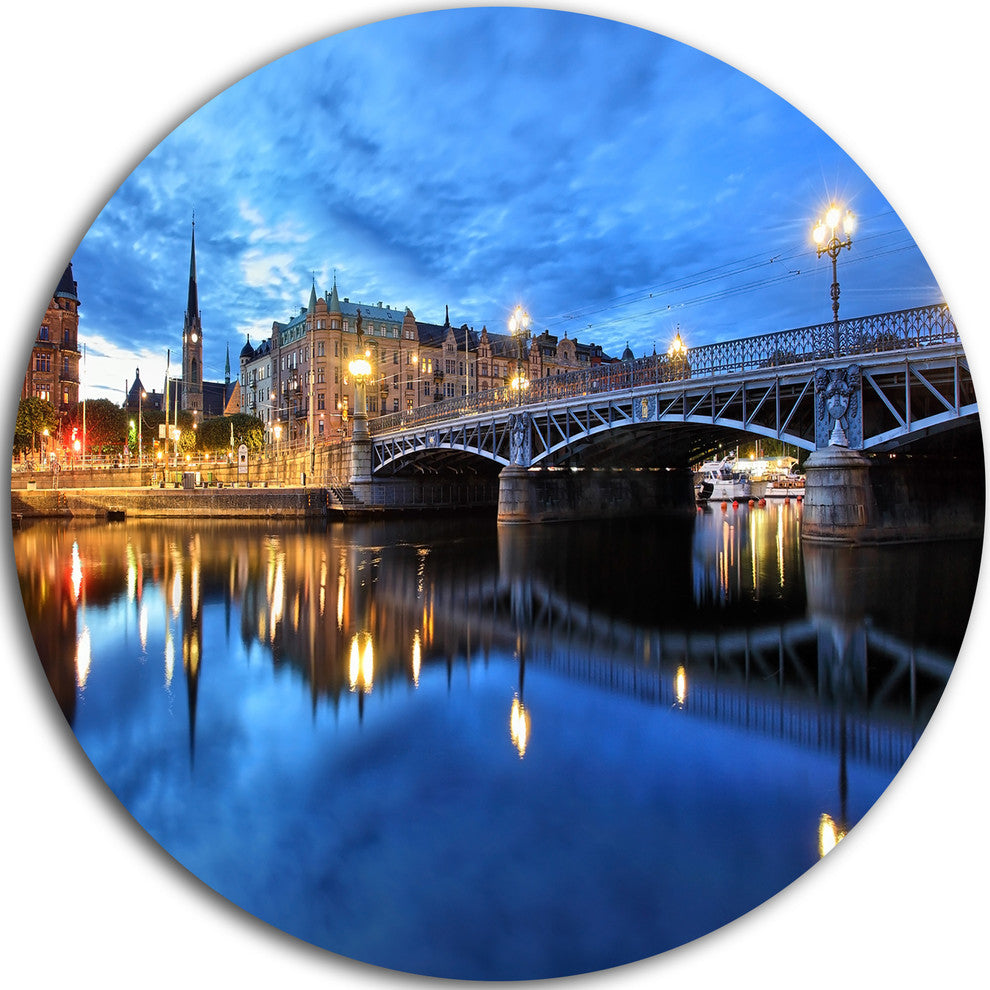 Illuminated Blue Stockholm, Cityscape Disc Metal Artwork, 11"