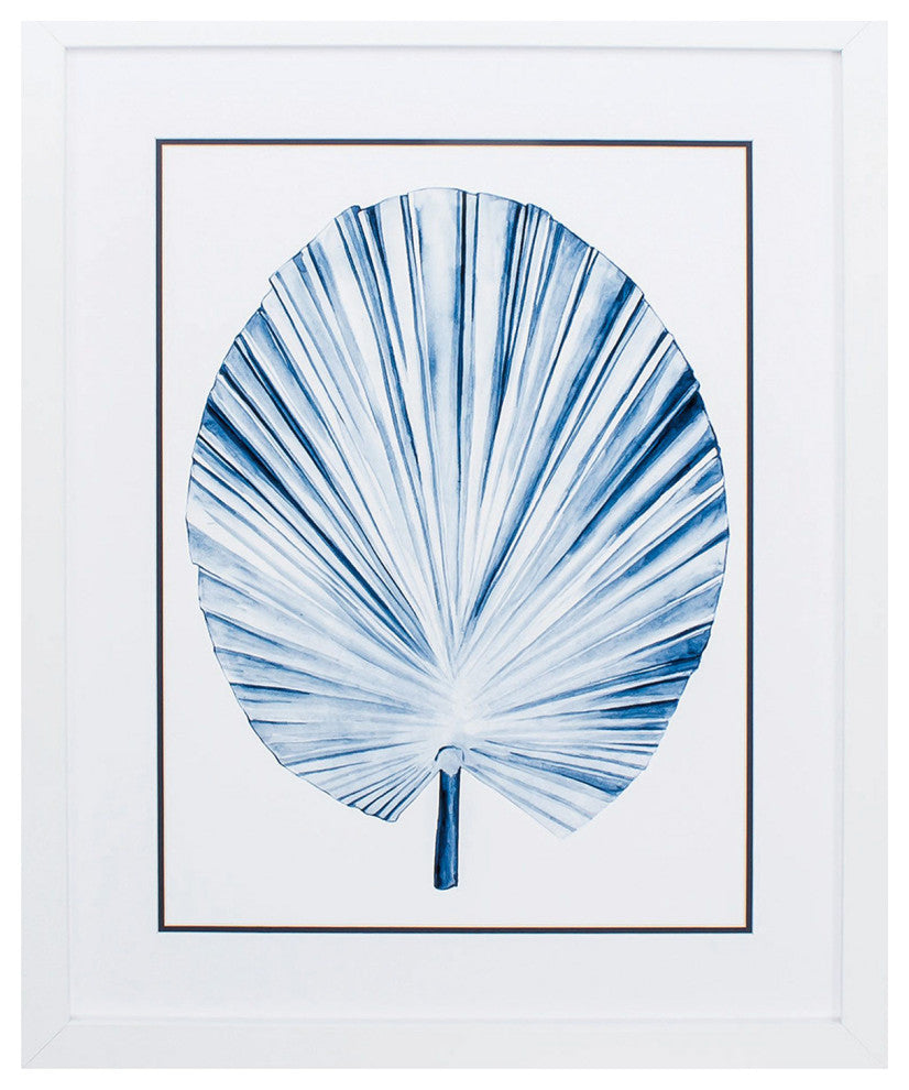 A blue tropical leaf image is double matted in white and navy blue. Framed in a block profile moulding with a matte white finish.