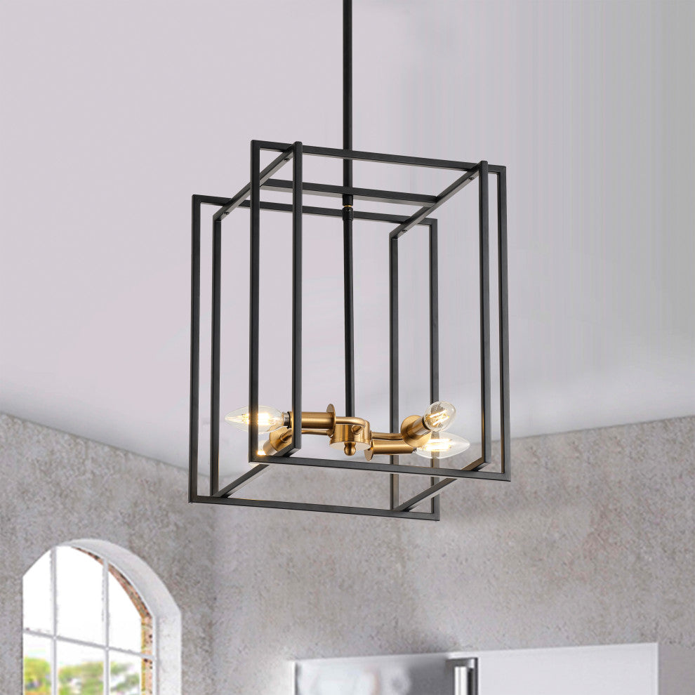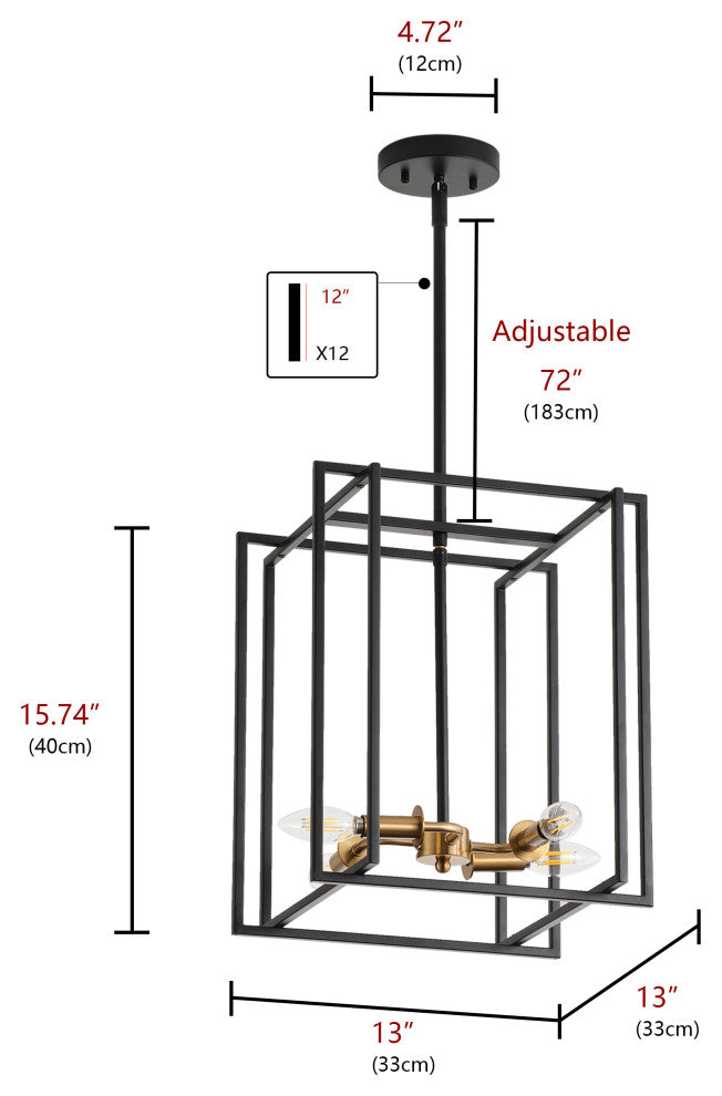 Specifications:Style: Industrial Pendant LightMaterials: IronColor: Matte BlackVoltage: 120VWattage: 40W (per bulb)Bulb Base: E12Dimensions: 13 in. W x 13 in. D x 15.74 in. HNumber of Lights: 4 Lights (bulbs not included)Chain/Cord/Rod Length: 12• 12"Adjustable or Not: YesFeatures:ã€?Industrial Rectangle Design】The rectangular pendant light boasts a lantern-style metal cage and four candlestick lights, providing an industrial ambiance. The black matte and brass finish adds a rustic touch and minimalist style perfect for any home decor.ã€?Quality Assurance】High-quality metal materials were used to craft the pendant light. All products in the factory have to undergo rigorous safety monitoring, to ensure quality and safety, which is beautiful, corrosion-resistant, and durable for a long time.ã€?Easy to Install】There is no need to worry about the installation difficulty, to achieve installation quickly, all installation hardware and installation instructions are included in the package for you. If you have any problems please feel freely to contact us.ã€?ETL Listed & Bulb Requirement】ETL Listed for your safety. The industrial pendant light is a built-in standard E12 socket, suggest using a dimmable E12• 4 base bulb (Max 40W, 120V), it could be fully dimmable and compatible dimmer switch. Bulbs and dimmer switch not included.ã€?Suitable for Various Scences】Industrial with a farmhouse feel, this black metal frame pendant light is perfect for wide application, kitchen island, dining room, living room, hallway, entryway, foyer, stairway, farmhouse, bars, cafes, hotels, and restaurants, etc.Notes: Adjustable hanging cord according to your need.Elegant and beautiful shape room lighting.It can create a romantic atmosphere and give sparkle to brilliant evenings.Not only a durable and safe pendant light but also a nice light decoration, for homes, bars, restaurants, and so on.