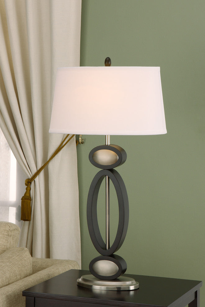 Bring a touch of class to any room with this contemporary Infinity table lamp from Artiva USA. Made of metal and wood in a two-tone brushed steel and dark walnut finish, this stylish and modern lamp set is the perfect addition to any home or office.