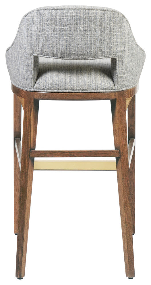 The Inga Bar Stool covered in a Greenlight Powder fabric has an upholstered back and seat that sits nimbly atop a solid oak frame in a morel brown finish. The paleness of the fabric and the warmth of the wood create a soft contrast, while the brass kick-plate brings a bit of brightness to the design.