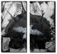 InkdV'' is a square gallery wrapped canvas 2 piece art set exhibiting deep white and sharp black brush strokes, nebulous drips and layers of contrast. Centered is an inkd bird, spotted white and pale blue.