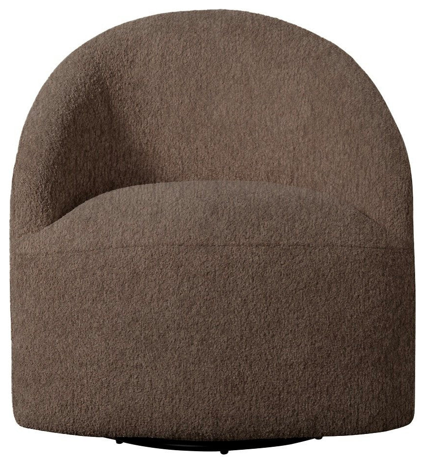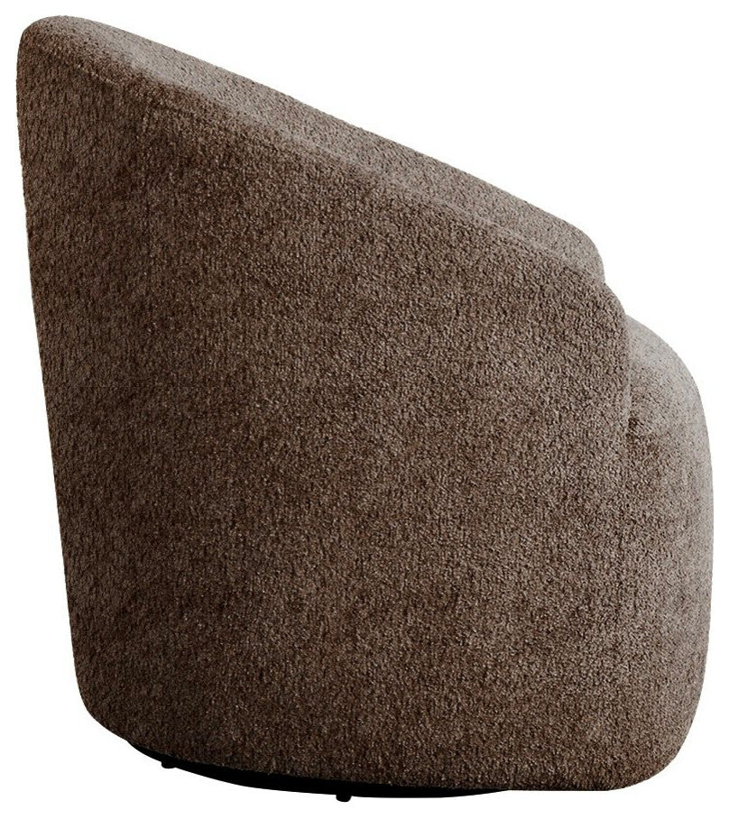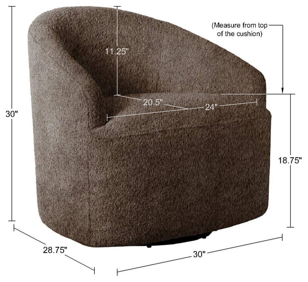 DESCRIPTIONAdd a comfortable and casual flair to your home with this swivel chair. This barrel-style chair is upholstered in a soft textured boucle fabric and has a tight attached seat to create a modern minimalist look. The sloped arms provide additional comfort to make this motion chair stylish and cozy. A hidden swivel base helps maintain the clean and seamless silhouette, while also allowing the accent chair to rotate 360 degrees making it a chic addition to your living room or bedroom.FEATURES? Fully upholstered swivel chair made from a soft textured boucle fabric? Barrel-style chair shape with attached tight seat gives this chair a modern, minimalist and transitional look? Sloped arms give extra seating comfort? 360 degree hidden metal swivel base? Fully assembled, ready for use? High-density foam offers superior support and may feel initially firm. Over time, the foam will soften and provide optimal comfortMATERIALSFrame: Solid wood and plywoodLeg: Metal ringArm: Solid wood and plywoodFabric: 100% polyester, wovenSeat Cushion Fill: FoamMetal Finish: BlackSIZE DESCRIPTIONOverall:30"W x 28.75"D x 30"HSeat Dimensions:24"W x 20.5"D x 18.75"HArm Height:21.5"HBack Rest Size:23"W x 11.25"HMaximum Weight Capacity:300 lbs