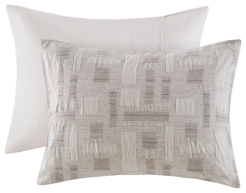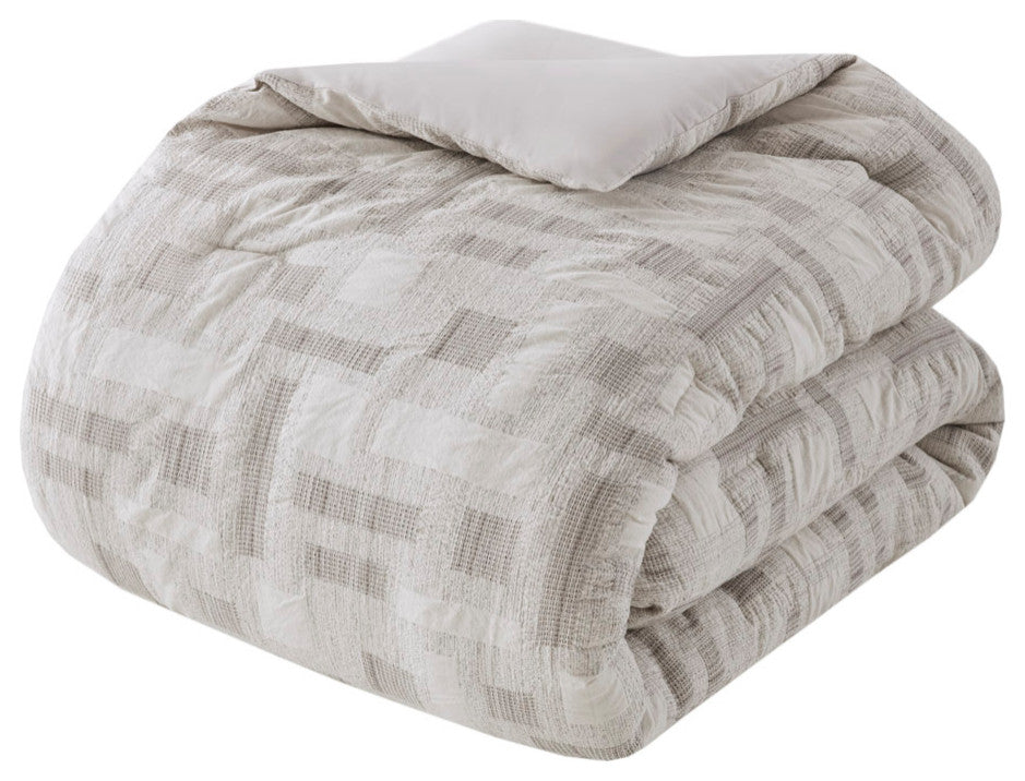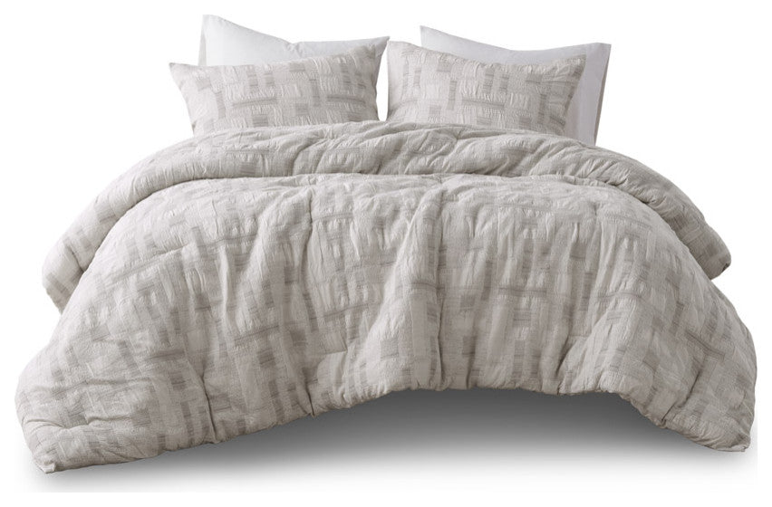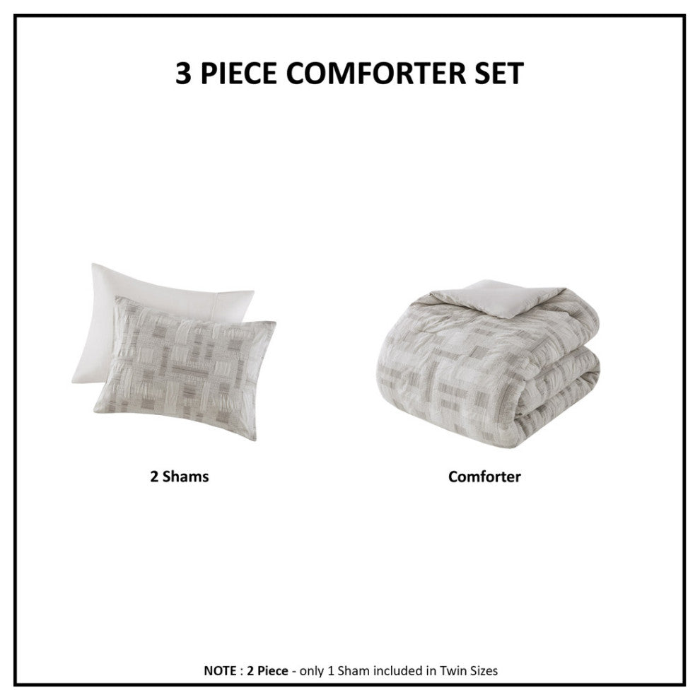 DESCRIPTIONIntroducing the new artisanal pattern from INK+IVY, designed to bring a unique touch of craftsmanship to your bedroom. This collection includes 100% cotton comforter and 2 matching shams, each with an easy overlap closure. This comforter features a beautifully designed jacquard weave with a geometric pattern that adds visual interest and texture. Notably, the comforter is filled with 100% hypoallergenic polyester, ensuring it contains no allergens and is dustproof for your peace of mind and comfort. The visible bartacks on the comforter not only add a decorative touch, but also help maintain the insert''s shape and quality over time. As an OEKO-TEX certified textile, you can rest assured knowing this product is safe to be in contact with your skin. The entire set is machine washable for easy care (please see the care label for detailed instructions), and we recommend using a commercial washer and dryer to provide ample room for movement and ensure optimal cleaning results.FEATURES? Set includes comforter and 2 shams (overlap closure)? 100% cotton comforter, 100% polyester filling ? Cotton jacquard comforter, designed with an artisanal touch and feel? Visible bartacks, helps maintain the inserts shape and quality ? OEKO-TEX labeled textile certified as safe on skin ? Hypoallergenic polyester comforter filling contains no allergen and is dust proof ? Machine washable (see care label)? Commercial washer and dryer recommended to provide ample room for movementMATERIALSComforter/Shams: 100% cotton jacquard, 100% cotton solid reverseFill: 100% polyesterSIZE DESCRIPTION1 Comforter:90"W x 92"L2 Standard Shams:20"W x 26"L (2)