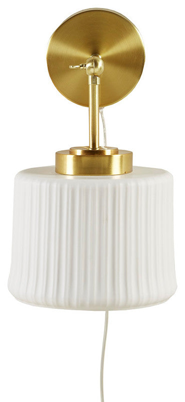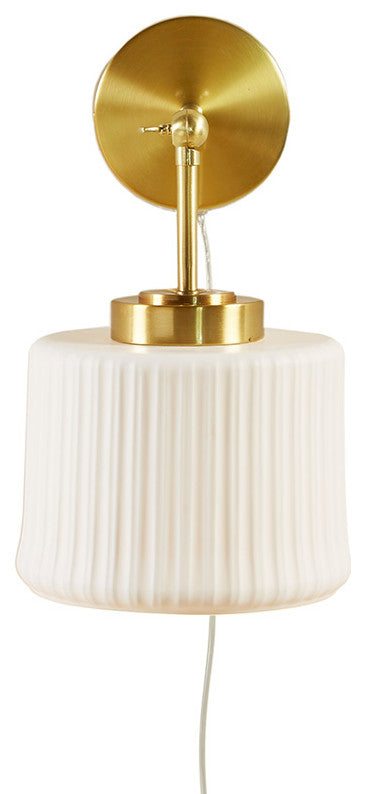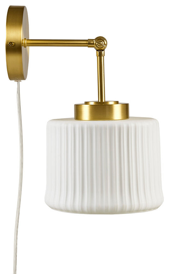 DESCRIPTIONExplore INK+IVY''s Luminex Wall Sconce, blending style and practicality. Crafted from durable iron in brushed gold, it features a white ceramic shade with pleated design and an adjustable swing arm for precise light control. The arm is designed to move up, down, and angle left and right, ensuring optimal light direction. Illuminate effortlessly using the 60-inch clear cord (bulb not included). Note: Not dimmable; for indoor use. Elevate your space with this contemporary elegance!FEATURES? Made from iron in a modern brushed gold finish? White ceramic shade with pleated design with a brushed gold adjustable swing arm? Adjustable swing arm is design to move up, down, and angle left and right. ? Overall 12.5"H x 7.5"W, Extends 9.5" from the wall? Backplate is Dia.4.75". Shade is Dia. 7.5" x 5.5"H? Plug-in, 60 inch clear colored cord? On/off switch on cord? 1 Type B bulb is needed (not included), incandescent E12 40W or CFL 9W or LED 5W.? Not dimmable; Polarized Plug? To protect finish, do not apply abrasive household cleaners. Dust with a soft, dry cloth.? Indoor use onlyMATERIALSMaterial: 50% ceramic, 50% ironBase Material: 100% ironBase Finish: GoldShade Material: 100% ceramicSIZE DESCRIPTIONOverall:7.5"W x 9.5"D x 12.5"HShade:Dia.7.5" x 5.5"HMounting Deck:Dia.4.75" x 1"HCord:60"L
