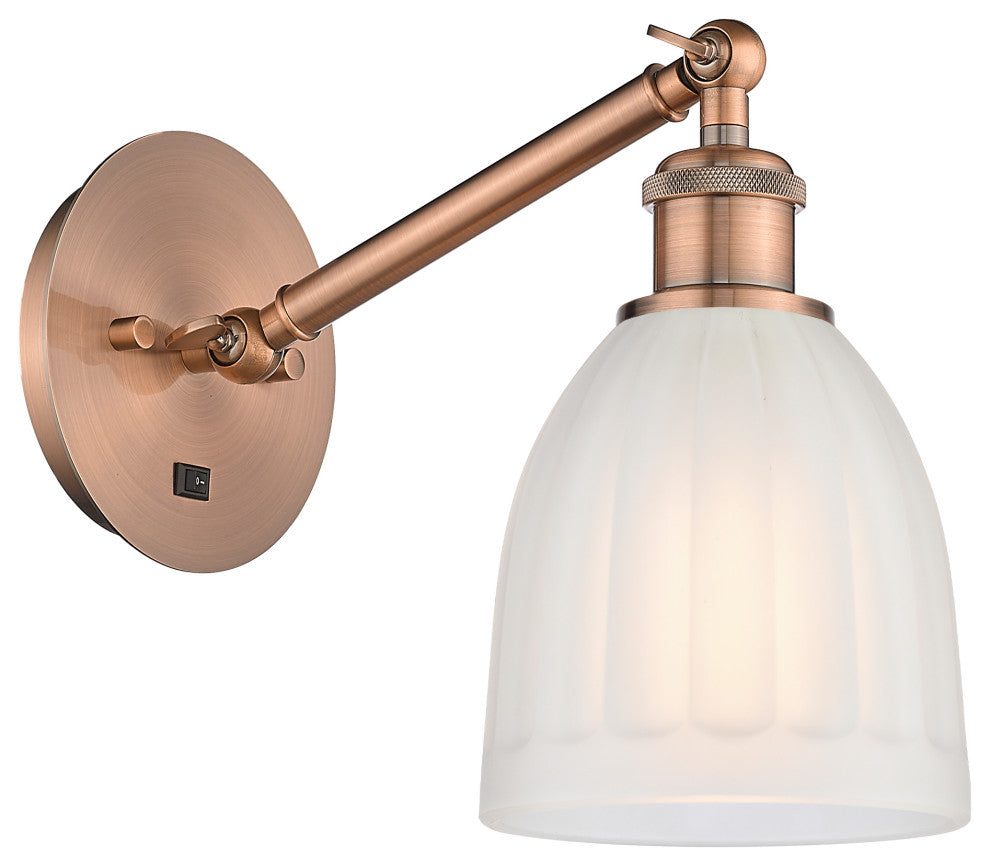 Innovations 317-1W-AC-G441 1-Light Sconce Antique Copper. Collection: Ballston. Style: Art Nouveau, Industrial, Restoration-Vintage, Transitional. Metal Finish: Antique Copper. Metal Finish (Canopy/Backplate): Antique Copper. Material: Steel, Cast Brass, Glass. Dimension(in): 12. 75(H) x 5. 75(W) x 12. 875(Ext). Bulb: (1)60W Medium Base,Dimmable(Not Included). Maximum Wattage Per Socket: 100. Voltage: 120. Color Temperature (Kelvin): 2200. CRI: 99. 9. Lumens: 220. Glass Shade Description: White Brookfield. Glass or Metal Shade Color: White. Shade Material: Glass. Glass Type: Frosted; Ribbed. Shade Shape: Drum. Shade Dimension(in): 5. 75(W) x 6(H). Fitter Measurement (Glass Or Metal Shade Fitter Size): Neckless with a 2. 125 inch Hole. Backplate Dimension(in): 5. 3(Dia) x 0. 75(Depth). ADA Compliant: No. California Proposition 65 Warning Required: Yes. UL and ETL Certification: Damp Location.