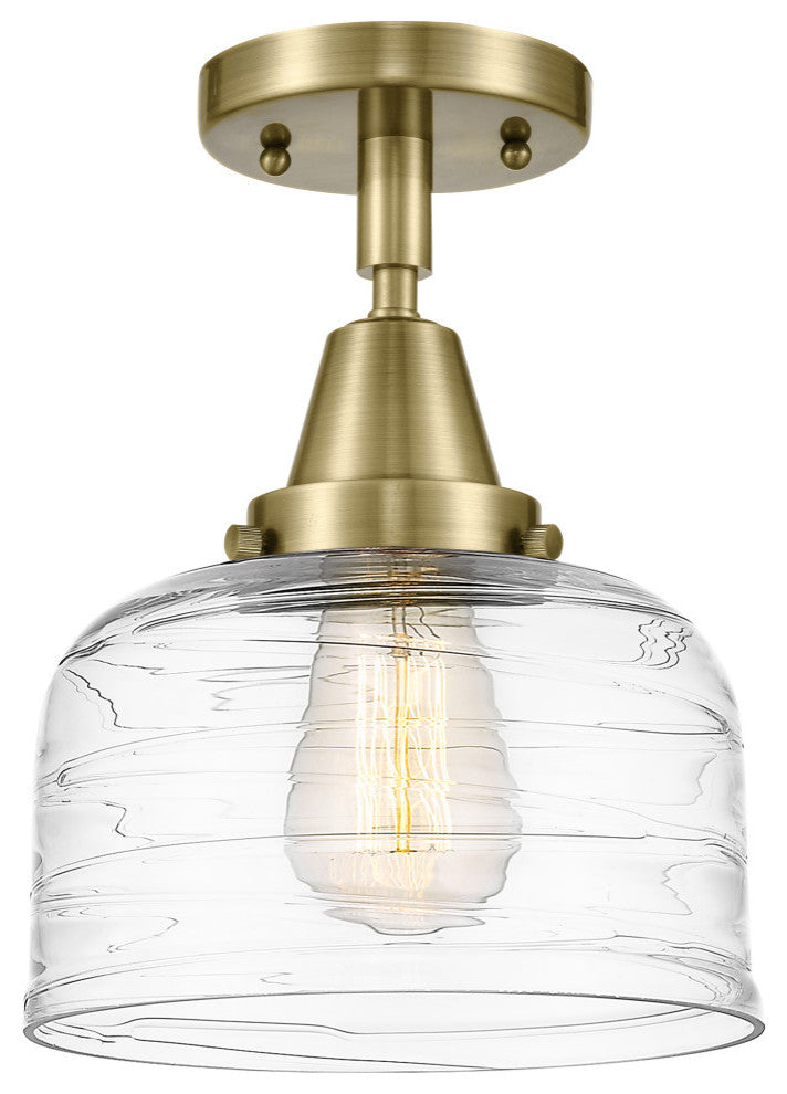 Innovations 447-1C-AB-G713-LED 1-Light Flush Mount Antique Brass. Collection: Franklin Restoration. Style: Industrial, Farmhouse, Restoration-Vintage, Traditional. Metal Finish: Antique Brass. Metal Finish (Canopy/Backplate): Antique Brass. Material: Steel, Glass. Dimension(in): 10. 375(H) x 8(W) x 8(Dia). Bulb: (1)6W Medium Base,Dimmable(Not Included). Maximum Wattage Per Socket: 100. Voltage: 120. Color Temperature (Kelvin): 2700. CRI: 82. Lumens: 600. Glass Shade Description: Clear Deco Swirl Large Bell. Glass or Metal Shade Color: Clear Deco Swirl. Shade Material: Glass. Glass Type: Transparent. Shade Shape: Bell. Shade Dimension(in): 8(W) x 5. 75(H). Fitter Measurement (Glass Or Metal Shade Fitter Size): 3. 25 inch Fitter. Canopy Dimension(in): 4. 5(Dia). Sloped Ceiling Compatible: Yes. California Proposition 65 Warning Required: Yes. UL and ETL Certification: Damp Location.