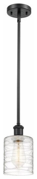 Innovations 516-1S-BK-G1113 1-Light Mini Pendant Matte Black. Collection: Ballston. Style: Art Nouveau, Industrial, Restoration-Vintage, Transitional. Metal Finish: Matte Black. Metal Finish (Canopy/Backplate): Matte Black. Material: Steel, Cast Brass, Glass. Dimension(in): 8(H) x 5(W) x 5(Dia). Min/Max Height (Fixture Height with Cord or Included Stems and Canopy)(in): 17. 75/41. 75. Bulb: (1)60W Medium Base,Dimmable(Not Included). Maximum Wattage Per Socket: 100. Voltage: 120. Color Temperature (Kelvin): 2200. CRI: 99. 9. Lumens: 220. Glass Shade Description: Deco Swirl Cobbleskill. Glass or Metal Shade Color: Deco Swirl. Shade Material: Glass. Glass Type: Transparent. Shade Shape: Drum. Shade Dimension(in): 5(W) x 6(H). Fitter Measurement (Glass Or Metal Shade Fitter Size): Neckless with a 2. 125 inch Hole. Canopy Dimension(in): 4. 5(Dia) x 0. 75(H). Sloped Ceiling Compatible: Yes. California Proposition 65 Warning Required: Yes. UL and ETL Certification: Damp Location.