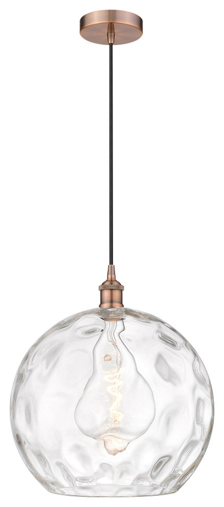 Innovations 616-1P-AC-G1215-14 1-Light Pendant Antique Copper. Collection: Edison. Style: Industrial, Modern Contempo, Restoration-Vintage, Transitional. Metal Finish: Antique Copper. Metal Finish (Canopy/Backplate): Antique Copper. Material: Steel, Cast Brass, Glass. Dimension(in): 16. 875(H) x 13. 75(W) x 13. 75(Dia). Min/Max Height (Fixture Height with Cord or Included Stems and Canopy)(in): 19. 875/136. 875. Wire/Cord: 10 Feet Of Black Fabric Cord. Bulb: (1)60W Medium Base,Dimmable(Not Included). Maximum Wattage Per Socket: 100. Voltage: 120. Color Temperature (Kelvin): 2200. CRI: 99. 9. Lumens: 220. Glass Shade Description: Clear Athens Water Glass 14". Glass or Metal Shade Color: Clear Water Glass. Shade Material: Glass. Glass Type: Transparent. Shade Shape: Sphere. Shade Dimension(in): 13(W) x 12. 125(H). Fitter Measurement (Glass Or Metal Shade Fitter Size): Neckless with a 2. 125 inch Hole. Canopy Dimension(in): 4. 75(Dia) x 1(H). Sloped Ceiling Compatible: Yes. California Proposition 65 Warning Required: Yes. UL and ETL Certification: Damp Location.