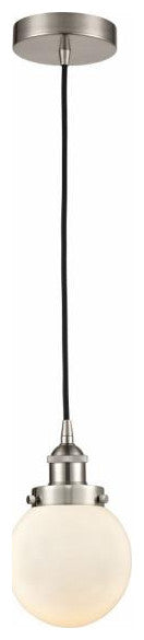 Innovations 616-1PH-SN-G201-6 1-Light Mini Pendant Brushed Satin Nickel. Collection: Edison. Style: Industrial, Restoration-Vintage, Traditional. Metal Finish: Brushed Satin Nickel. Metal Finish (Canopy/Backplate): Brushed Satin Nickel. Material: Steel, Cast Brass, Glass. Dimension(in): 9. 5(H) x 6(W) x 6(Dia). Min/Max Height (Fixture Height with Cord or Included Stems and Canopy)(in): 13/131. Wire/Cord: 10 Feet Of Black Fabric Cord. Bulb: (1)60W Medium Base,Dimmable(Not Included). Maximum Wattage Per Socket: 100. Voltage: 120. Color Temperature (Kelvin): 2200. CRI: 99. 9. Lumens: 220. Glass Shade Description: Matte White Cased Beacon. Glass or Metal Shade Color: Matte White. Shade Material: Glass. Glass Type: Frosted. Shade Shape: Globe. Shade Dimension(in): 6(W) x 5. 75(H). Fitter Measurement (Glass Or Metal Shade Fitter Size): 3. 25 inch Fitter. Canopy Dimension(in): 4. 75(Dia) x 1(H). Sloped Ceiling Compatible: Yes. California Proposition 65 Warning Required: Yes. UL and ETL Certification: Damp Location.