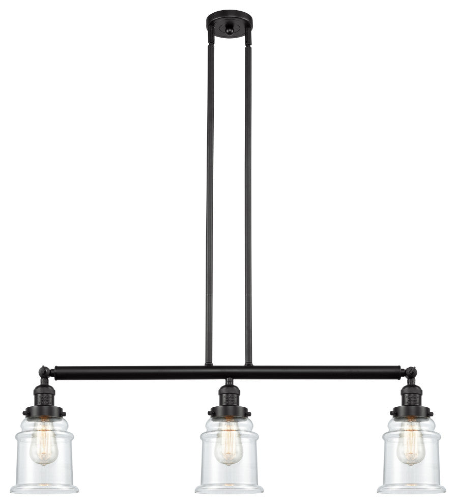 INNOVATIONS LIGHTING 213-OB-S-G182-LED 3 Light Vintage Dimmable LED Island LightCanton 3-Vintage Dimmable LED 6 inch OiDimmable LED Rubbed Bronze Adjustable Island Light with Clear glass and Solid Brass Hang Straight SwivelsCollection: CantonMetal Finish: Oiled Rubbed BronzeMaterial: Cast Brass, GlassGlass Color: Oiled Rubbed BronzeGlass/Metal Shade Color: ClearGlass/Shade Description: Clear CantonDimension(in): 36(Max L) x 6(W) x 11(H)Cord/Wire: 10 Feet WireGlass Shade Dimension(in): 6 X 7.25Shade Fitter Size: 3.25 inch FitterCanopy Dimension(in): 4.5(Dia)Bulb: (3)3 Watt LED Vintage Medium Base Bulb IncludedMax Watts Per Socket: 100Color Temperature: 3000 KelvinLumens: 265CRI: 80UL Certification Type: Damp LocationETL Certification Type: Damp Location