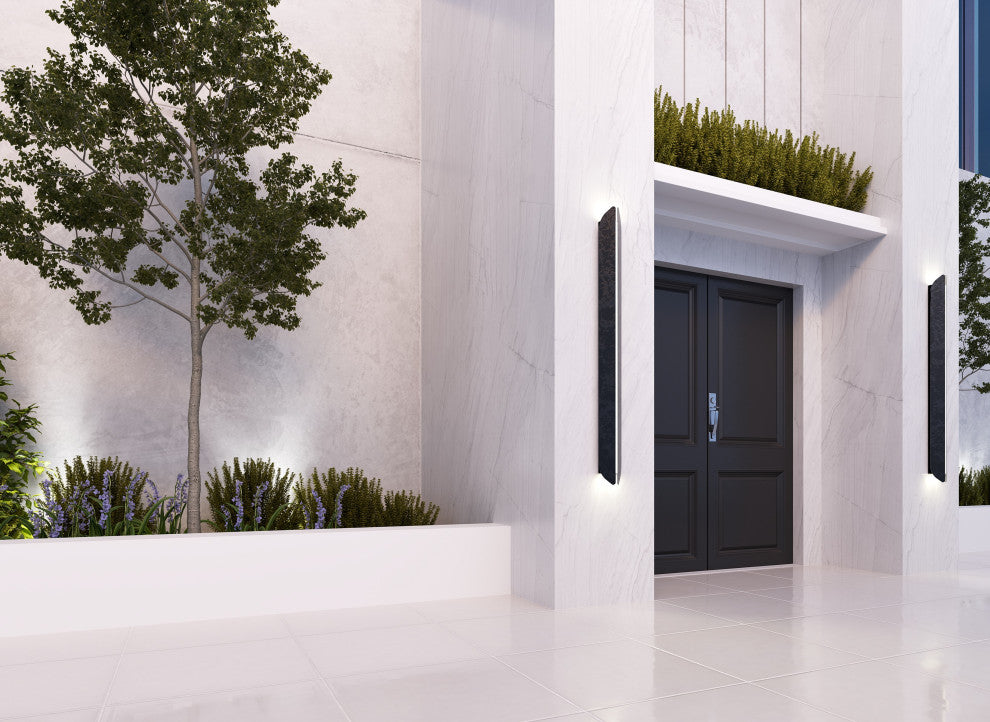 This sleek and modern 60-inch outdoor wall sconce in Damascus Black brings an elegant and powerful touch to any exterior space. Featuring integrated LED technology, it provides both ambient and functional lighting for larger outdoor areas like entryways or patios. Its contemporary design fits seamlessly with maximalist architecture while offering durability for all weather conditions. This product is cETLus certified.•Number of Lights: 1•Bulb Type: LED integrated•Wattage: 67W•LED Color Temperature (K): 3000K•Dimmable: Yes•Bulb Included: Yes•Voltage: 120V•Hardwire or Plug-in: Hardwired