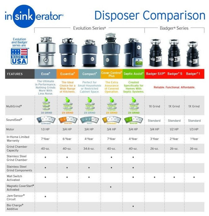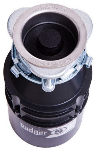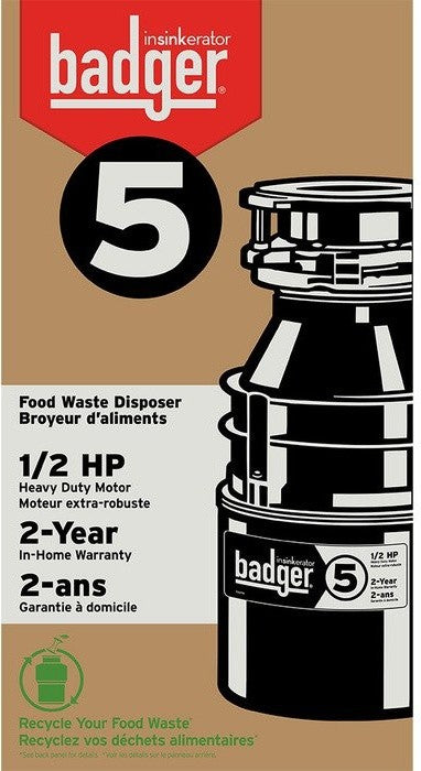 InSinkErator® Badger 5 garbage disposals are a reliable and functional choice when affordability is the prime concern. 1/2 HP motor that rapidly grinds food waste for easy rinsing down the drain. From the powerful induction motors to the rugged galvanized steel construction, the Badger 5 food waste disposer delivers exceptional performance.• 1/2 Horsepower Dura-Drive® Induction Motor• Galvanized steel construction• Made in the USA• Quick Lock® Sink Mount allows for easy installation and disposer replacement• Power cord not included.Specs:• Type of Feed: Continuous• On/Off Control: Wall Switch• Motor: Single Phase• HP: 1/2• Volts: 120• HZ: 60• RPM: 1725• Amp. (Avg. Load): 6.3• Time Rating: Intermittent• Lubrication: Permanently Lubricated Upper & Lower Bearings• Unit Finish: Waterborne Grey Enamel• Overall Height: 12-5/8"• Grind Chamber Capacity: 26 oz.• Motor Protection: Manual Reset Overload• Average Water Usage: 1 Gallon Per Person Per Day• Average Electrical Usage: 3-4 KWh Per Year• Drain: 1-1/2"• Anti-Vibration Connection: (Hose Clamp)• Dishwasher Drain Connection: Yes