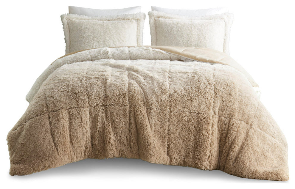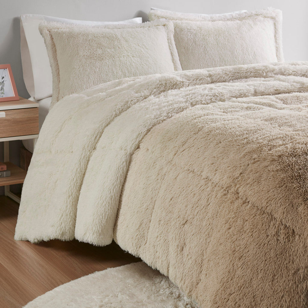 Create a cozy and comfy space with the Intelligent Design Brielle Shaggy Faux Fur Comforter Mini Set. This shaggy fur comforter features an ombre design with a soft, warm faux mink reverse, bringing you ultimate warmth and comfort. The set includes matching shams that coordinate with the comforter. The hypoallergenic polyester filling in the comforter contains no allergens and is treated to be dustproof. Machine washable for easy care, this faux fur comforter cradles you in lush comfort.FEATURESCozy shaggy fur comforter features an ombre design Soft and warm faux mink reverseHypoallergenic polyester filling contains no allergens and is treated to be dustproofSet includes comforter and two matching shams (1 sham in Twin/Twin XL)Machine wash separately in large capacity washer with cold water on gentle cycle, do not use fabric softener or bleachTumble dry separately in large capacity dryer on low heatMinor shedding is expected with faux fur material and should subside after 3-4 washesOeko-Tex Certified, includes no harmful substances or chemicalsFor best result before first use, put the product in dry with setting "no heat" of "air fluff" to remove loose fibers and reduce sheddingMATERIALSComforter/Sham: 100% polyester shaggy long fur to solid plush, 100% polyester filling, jump tack quilting, knife edgeSham: 3" overlap on back openSIZE 1 Comforter:104"W x 90"L2 King Shams:20"W x 36"L + 2"D (2)