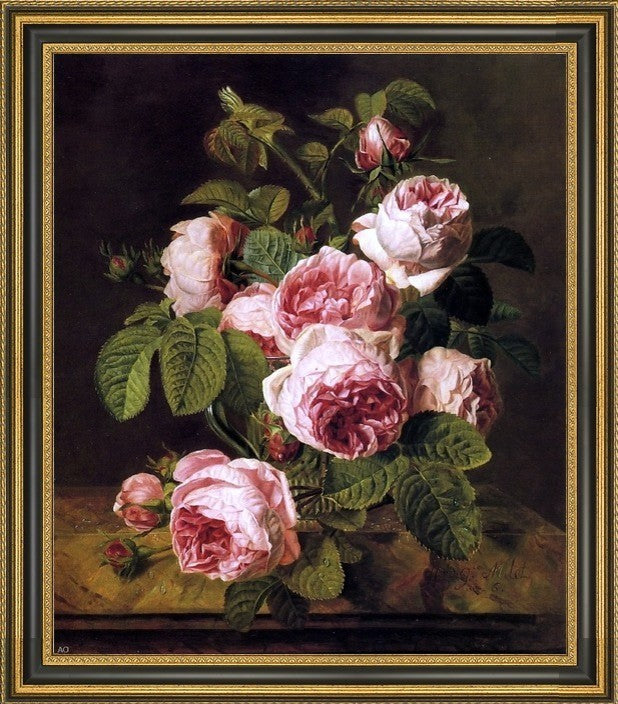 16" x 20" Iphigenie Milet-Mureau Pink Roses on a Marble Ledge framed premium canvas print reproduced to meet museum quality standards. Our Museum quality canvas prints are produced using high-precision print technology for a more accurate reproduction printed on high quality canvas with fade-resistant, archival inks. Our progressive business model allows us to offer works of art to you at the best wholesale pricing, significantly less than art gallery prices, affordable to all. This artwork is hand stretched onto wooden stretcher bars, then mounted into our 3 3/4" wide gold finish frame with black panel by one of our expert framers. Our framed canvas print comes with hardware, ready to hang on your wall. We present a comprehensive collection of exceptional canvas art reproductions by Iphigenie Milet-Mureau.