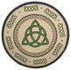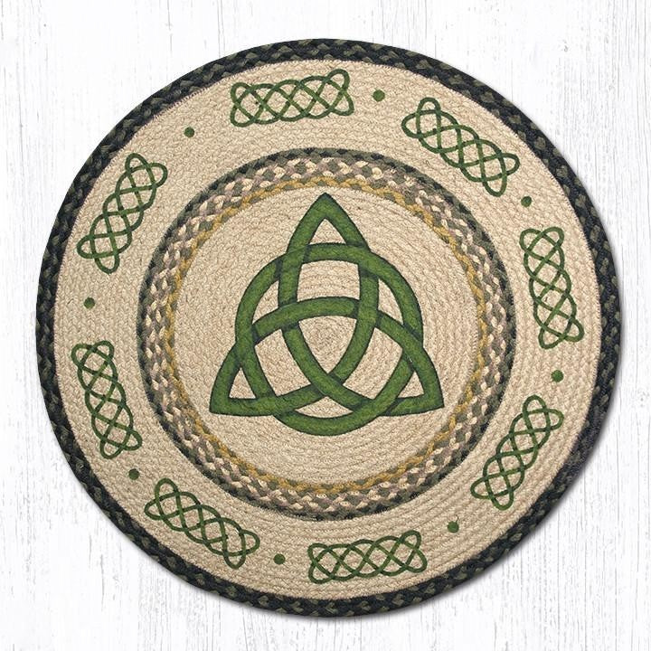Irish Knot Round Rug 27"x27". Made in Bangladesh from 100% Natural Jute which is Biodegradeable & Eco-Friendly. Jute is also one of the strongest fibers known to man. Clean with mild soap and cold water. Do not machine wash. Design is Hand Stenciled.