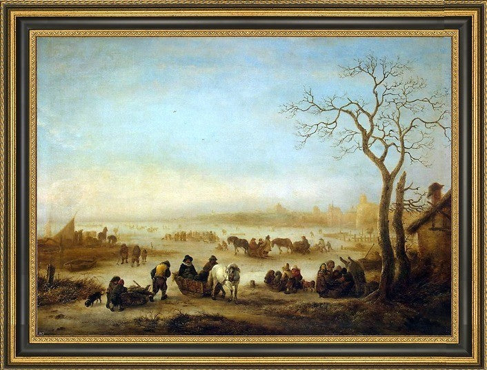 16" x 24" Isaac Van Ostade Frozen Lake framed premium canvas print reproduced to meet museum quality standards. Our Museum quality canvas prints are produced using high-precision print technology for a more accurate reproduction printed on high quality canvas with fade-resistant, archival inks. Our progressive business model allows us to offer works of art to you at the best wholesale pricing, significantly less than art gallery prices, affordable to all. This artwork is hand stretched onto wooden stretcher bars, then mounted into our 3 3/4" wide gold finish frame with black panel by one of our expert framers. Our framed canvas print comes with hardware, ready to hang on your wall. We present a comprehensive collection of exceptional canvas art reproductions by Isaac Van Ostade.