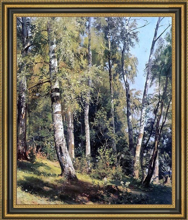 16" x 20" Ivan Ivanovich Shishkin Birch Grove framed premium canvas print reproduced to meet museum quality standards. Our Museum quality canvas prints are produced using high-precision print technology for a more accurate reproduction printed on high quality canvas with fade-resistant, archival inks. Our progressive business model allows us to offer works of art to you at the best wholesale pricing, significantly less than art gallery prices, affordable to all. This artwork is hand stretched onto wooden stretcher bars, then mounted into our 3 3/4" wide gold finish frame with black panel by one of our expert framers. Our framed canvas print comes with hardware, ready to hang on your wall. We present a comprehensive collection of exceptional canvas art reproductions by Ivan Ivanovich Shishkin.