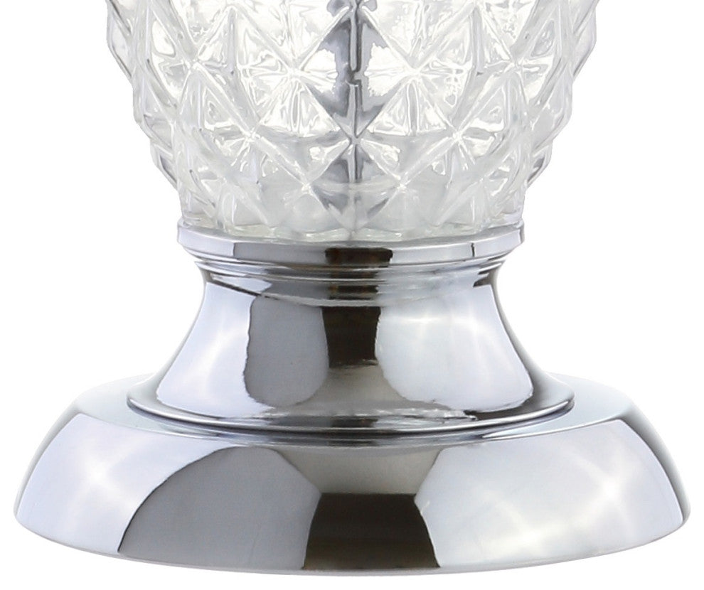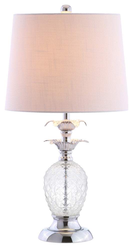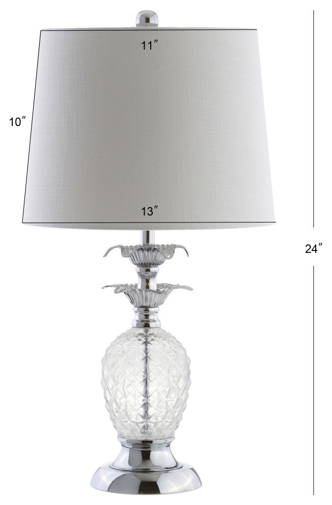 First introduced to Europe in the 1940s, pineapple was served only by affluent hosts who could afford it and determined their guests were worth the expense. In turn, the fruit became a symbol of generosity, hospitality and, of course, wealth. Create a sense of welcome in your home with our glass pineapple lamp trimmed in chrome fittings. And the best part? You won''t need to spend a fortune to bring this symbol of warmth into your home.-Clear glass pineapple lamp made from glass and silver is a classic expression of hospitality-100% cotton hardback drum shade-Beautiful to display or easy to conceal: the 60" cord is silk-wrapped-On-off rotary switch on socket-Takes one bulb and compatible with any 12W LED or 100W incandescent or 23W CFL-Eco-friendly 9W LED bulb included-UL Listed-Color: Clear/Chrome with white shade-Body Material: Glass-Base Material: Iron-Finial Material: Plastic-Finial Color: Chrome-Harp Color: Silver-Includes: 1 lamp(s)-Minor Assembly Required-Lamp: 24 inches high x 13 inches wide x 13 inches deep-Shade: 10 inches high x 13 inches wide x 13 inches deepYou see a lamp.We see a decorative work of art.A perfectly curved shade casts a dramatic shadow on a floor. A silk cord you never want to hide. LED lightbulbs: as easy on the environment as they are on the eyes. The JONATHAN Y Lighting collection considers every detail from impeccably sourced materials to designer styling. And our prices are so attractive, we''ve transformed a functional necessity into a fashion accessory.JONATHAN Y Lighting - a fashion revolution in home decor.