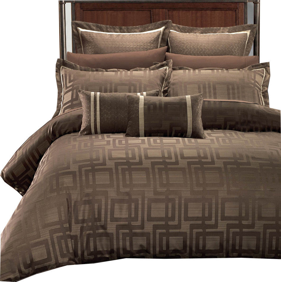 Apprise your bedroom or dorm room with this stylized Janet Multi Piece Bedding set by Royal Hotel. The bedding set features large scale stylish tones. The sham design further highlights the global style inspiration. This complete bed set comes with a decorative pillows to complete the look. The duvet cover set is completed with a duvet cover, coordinated pillow shams, European shams, decorative pillows, and a down alternative comforter (optional) with a 300 thread count cover. The overall look is one of the simplicity and elegance that will be enjoyed for years to come. The front of the duvet cover is made of 100-percent high quality polyester Jacquard and the back is made of cotton rich (50-percent cotton 50-percent polyester). - Royal Hotel Collection- 50-Percent Cotton & 50-Percent Polyester- Super Soft and cozy- Closure Buttons on footer hold comforter steadily in place- Multi-tone of charcoal brown and beige- Machine-washable in Cold water Only, Tumble Dry with Low Setting.Available Sets Include:- Full/Queen Size 7 Piece Set Includes: One Duvet Cover 90 wide x 92" long & Two Pillow Shams 20 x 26" long. Two Euro Shams 26 wide x 26" long. Two Decorative Pillows 12 x18" long.- King/Calking Size 7 Piece Set Includes: One Duvet Cover 106 wide x 92" long. Two Pillow Shams 20 x 36" long. Two Euro Shams 26 x 26" long. Two Decorative Pillows 12 x 18" long.