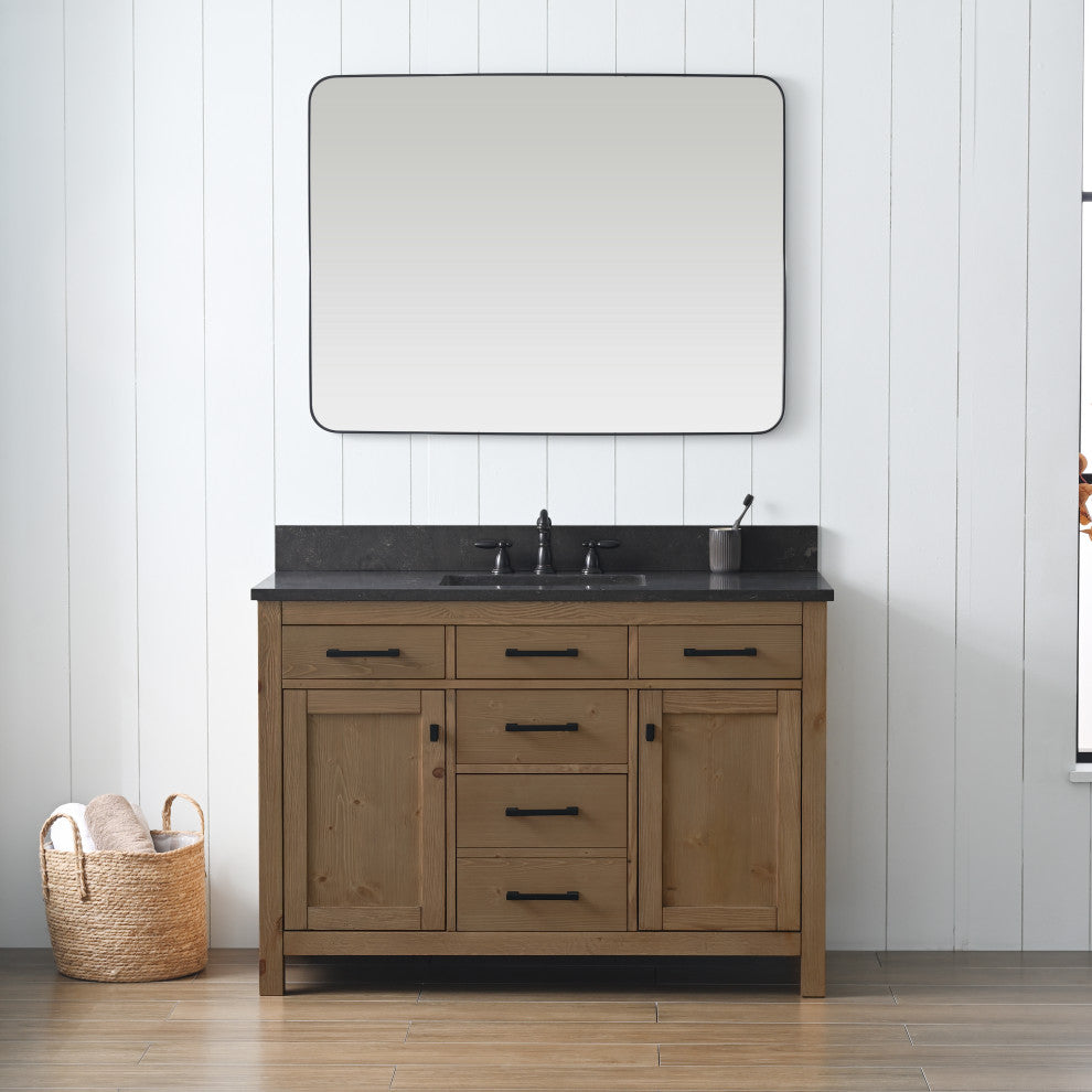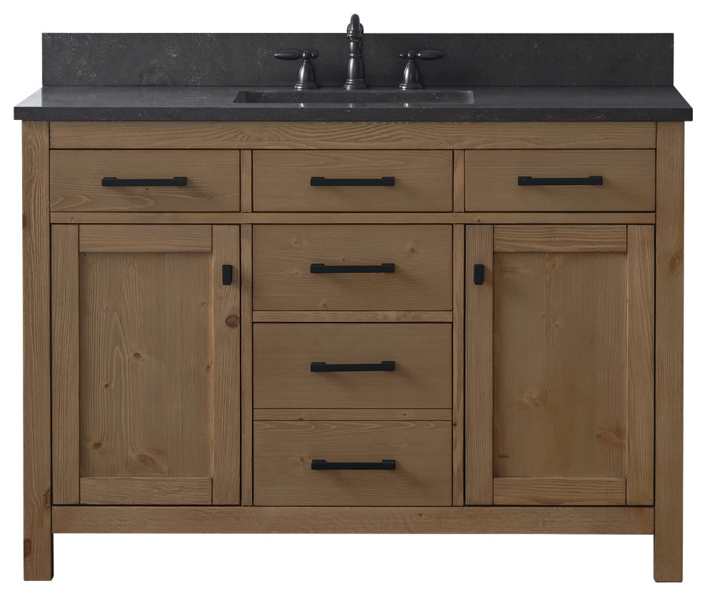 Maximize your bathroom space with this 48" vanity. Featuring beautiful textured wood grain veneer paired with a natural blue limestone top. Available in textured gray or weathered natural with matte black hardware