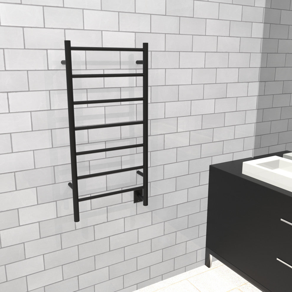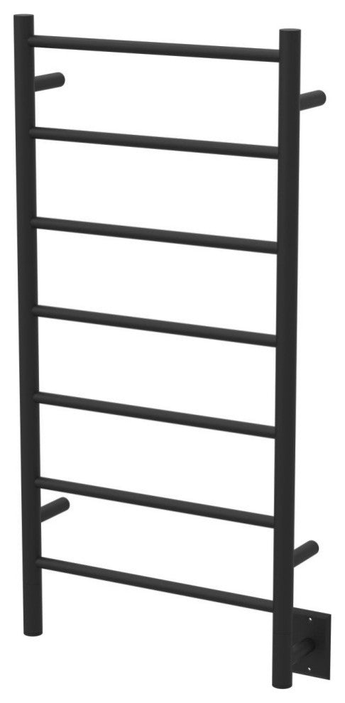 The Model F Straight in matte black has 7 straight horizontal bars and beautifully emulates the ladder style look. Unit takes 20 to 30min to heat up. Made of 304 stainless steel. 135 Watts, 1.25 Amps, 120V; 2 year limited warranty