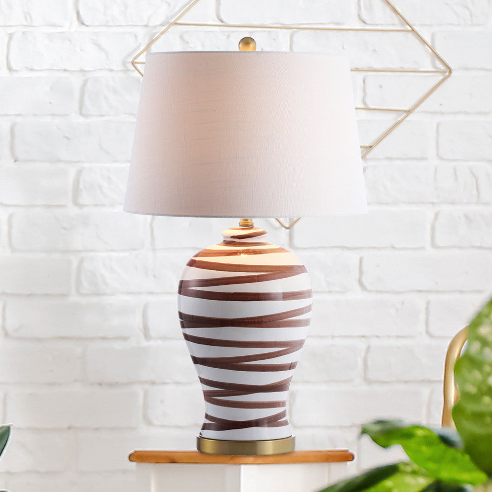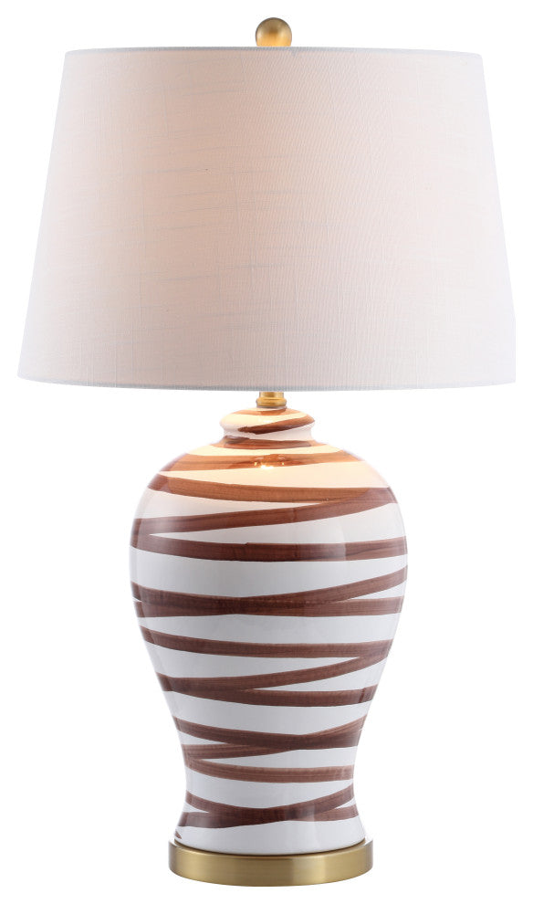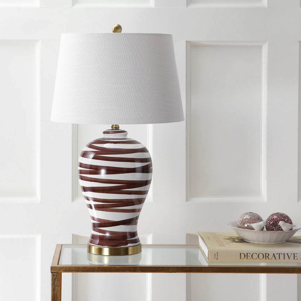 With artistic flair, the painterly glaze on this classic lamp silhouette brings one of this season''s hottest trends to your home. Applied by hand, the brown linear brushstrokes create an abstract effect on the smooth, curved body while a crisp white drum shade completes the look. Finished on each end with a brass base and finial, it''s a versatile style that will bring an understated note of artistic expression to any room. -Hand-painted vessel lamp base with a painterly glaze technique-100% cotton hardback drum shade-Beautiful to display or easy to conceal: the 60" cord is silk-wrapped-On-off rotary switch on socket-Takes one bulb and compatible with any 12W LED or 100W incandescent or 23W CFL-Eco-friendly 9W LED bulb included-UL Listed-Color: Brown/White with white shade-Body Material: Ceramic / Metal-Base Material: Iron-Finial Material: Metal-Finial Color: Brass Gold-Harp Color: Gold-Includes: 1 lamp(s)-Minor Assembly Required-Lamp: 29 inches high x 17 inches wide x 17 inches deep-Shade: 11 inches high x 17 inches wide x 17 inches deepYou see a lamp.We see a decorative work of art.A perfectly curved shade casts a dramatic shadow on a floor. A silk cord you never want to hide. LED lightbulbs: as easy on the environment as they are on the eyes. The JONATHAN Y Lighting collection considers every detail from impeccably sourced materials to designer styling. And our prices are so attractive, we''ve transformed a functional necessity into a fashion accessory.JONATHAN Y Lighting - a fashion revolution in home decor.