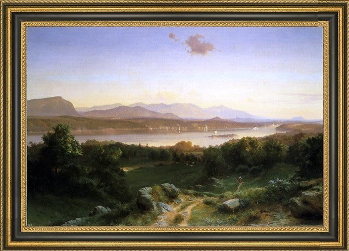 18" x 27" Johann Hermann Carmiencke View of The Hudson from Hyde Park framed premium canvas print reproduced to meet museum quality standards. Our Museum quality canvas prints are produced using high-precision print technology for a more accurate reproduction printed on high quality canvas with fade-resistant, archival inks. Our progressive business model allows us to offer works of art to you at the best wholesale pricing, significantly less than art gallery prices, affordable to all. This artwork is hand stretched onto wooden stretcher bars, then mounted into our 3 3/4" wide gold finish frame with black panel by one of our expert framers. Our framed canvas print comes with hardware, ready to hang on your wall. We present a comprehensive collection of exceptional canvas art reproductions by Johann Hermann Carmiencke.