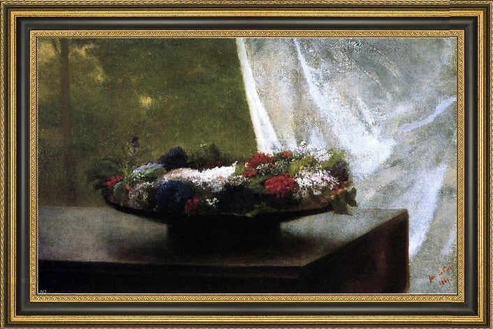 18" x 27" John La Farge Flowers in a Lacquer Bowl framed premium canvas print reproduced to meet museum quality standards. Our Museum quality canvas prints are produced using high-precision print technology for a more accurate reproduction printed on high quality canvas with fade-resistant, archival inks. Our progressive business model allows us to offer works of art to you at the best wholesale pricing, significantly less than art gallery prices, affordable to all. This artwork is hand stretched onto wooden stretcher bars, then mounted into our 3 3/4" wide gold finish frame with black panel by one of our expert framers. Our framed canvas print comes with hardware, ready to hang on your wall. We present a comprehensive collection of exceptional canvas art reproductions by John La Farge.